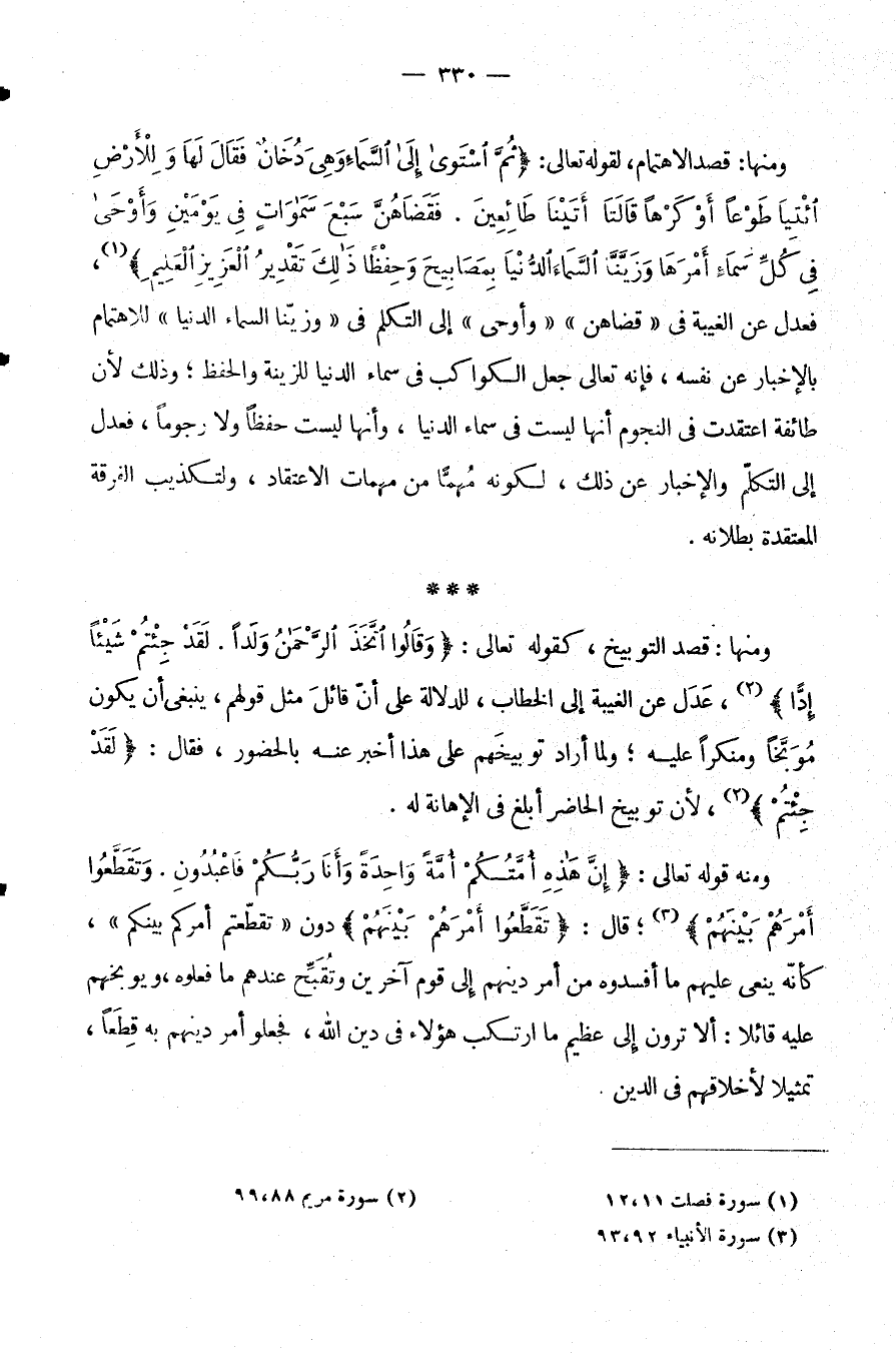 وَمِنْهَا: قَصْدُ الِاهْتِمَامِ، كَقَوْلِهِ تَعَالَى: {ثُمَّ اسْتَوَى إِلَى السَّمَاءِ وَهِيَ دُخَانٌ فَقَالَ لَهَا وَلِلْأَرْضِ اِئْتِيَا طَوْعًا أَوْ كَرْهًا قَالَتَا أَتَيْنَا طَائِعِينَ فَقَضَاهُنَّ سَبْعَ سَمَاوَاتٍ فِي يَوْمَيْنِ وَأَوْحَى فِي كُلِّ سَمَاءٍ أَمْرَهَا وَزَيَّنَّا السَّمَاءَ الدُّنْيَا بِمَصَابِيحَ وحفظا ذلك تقدير العزيز العليم} فَعَدَلَ عَنِ الْغَيْبَةِ فِي [قَضَاهُنَّ] وَ [أَوْحَى] إِلَى التَّكَلُّمِ فِي [وَزَيَّنَّا السَّمَاءَ الدُّنْيَا] لِلِاهْتِمَامِ بِالْإِخْبَارِ عَنْ نَفْسِهِ فَإِنَّهُ تَعَالَى جَعَلَ الْكَوَاكِبَ فِي سَمَاءِ الدُّنْيَا لِلزِّينَةِ وَالْحِفْظِ وَذَلِكَ لِأَنَّ طَائِفَةً اعْتَقَدَتْ فِي النُّجُومِ أَنَّهَا لَيْسَتْ فِي سَمَاءِ الدُّنْيَا وَأَنَّهَا لَيْسَتْ حِفْظًا وَلَا رُجُومًا فَعَدَلَ إِلَى التَّكَلُّمِ وَالْإِخْبَارِ عَنْ ذَلِكَ لِكَوْنِهِ مُهِمًّا مِنْ مُهِمَّاتِ الِاعْتِقَادِ وَلِتَكْذِيبِ الْفِرْقَةِ الْمُعْتَقِدَةِ بُطْلَانَهُ.