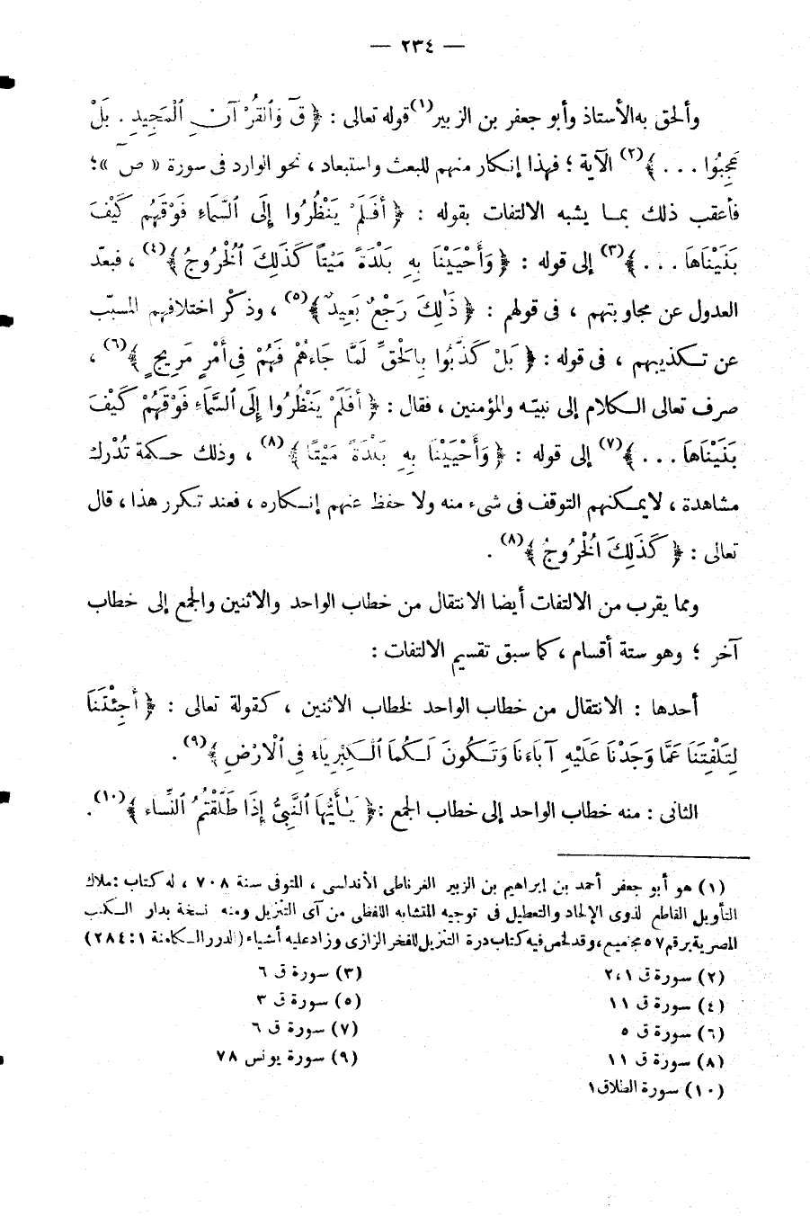 وَأَلْحَقَ بِهِ الْأُسْتَاذُ أَبُو جَعْفَرِ بْنُ الزُّبَيْرِ قَوْلَهُ تَعَالَى: {ق وَالْقُرْآنِ الْمَجِيدِ بَلْ عَجِبُوا..} الْآيَةَ، فَهَذَا إِنْكَارٌ مِنْهُمْ لِلْبَعْثِ وَاسْتِبْعَادٌ نَحْوُ الْوَارِدِ فِي سُورَةِ ص، فَأَعْقَبَ ذَلِكَ بِمَا يُشْبِهُ الِالْتِفَاتَ بِقَوْلِهِ: {أَفَلَمْ يَنْظُرُوا إِلَى السَّمَاءِ فوقهم كيف بنيناها..} إلى قوله: {وأحيينا به بلدة ميتا كذلك الخروج} ، فَبَعْدَ الْعُدُولِ عَنْ مُجَاوَبَتِهِمْ فِي قَوْلِهِمْ: {ذَلِكَ رجع بعيد} وَذِكْرِ اخْتِلَافِهِمُ الْمُسَبَّبِ عَنْ تَكْذِيبِهِمْ فِي قَوْلِهِ: {بَلْ كَذَّبُوا بِالْحَقِّ لَمَّا جَاءَهُمْ فَهُمْ فِي أمر مريج} ، صَرَفَ تَعَالَى الْكَلَامَ إِلَى نَبِيِّهِ وَالْمُؤْمِنِينَ فَقَالَ: {أَفَلَمْ يَنْظُرُوا إِلَى السَّمَاءِ فَوْقَهُمْ كَيْفَ بَنَيْنَاهَا..} إلى قوله: {وأحيينا به بلدة ميتا} وَذَلِكَ حِكْمَةٌ تُدْرَكُ مُشَاهَدَةً لَا يُمْكِنُهُمُ التَّوَقُّفُ فِي شَيْءٍ مِنْهُ وَلَا حُفِظَ عَنْهُمْ إِنْكَارُهُ فَعِنْدَ تَكَرُّرِ هَذَا قَالَ تَعَالَى: {كَذَلِكَ الْخُرُوجُ} .