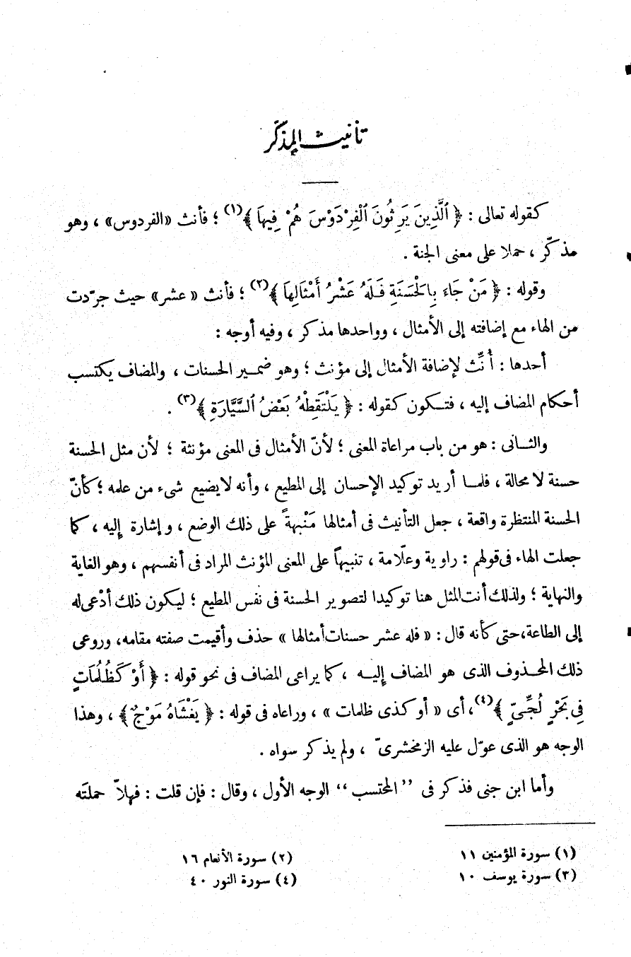 وَقَوْلِهِ: {مَنْ جَاءَ بِالْحَسَنَةِ فَلَهُ عَشْرُ أمثالها} ، فَأَنَّثَ [عَشْرُ] حَيْثُ جُرِّدَتْ مِنَ الْهَاءِ مَعَ إِضَافَتِهِ إِلَى الْأَمْثَالِ وَوَاحِدُهَا مُذَكَّرٌ وَفِيهِ أَوْجُهٌ:.