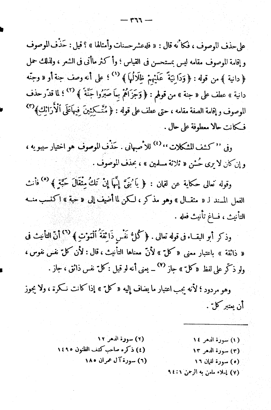 وَفِي "كَشْفِ الْمُشْكِلَاتِ" لِلْأَصْبِهَانِيِّ: حَذْفُ الْمَوْصُوفِ هُوَ اخْتِيَارُ سِيبَوَيْهِ وَإِنْ كَانَ لَا يَرَى حُسْنَ [ثَلَاثَةِ مُسْلِمِينَ] ، بحذف الموصوف.