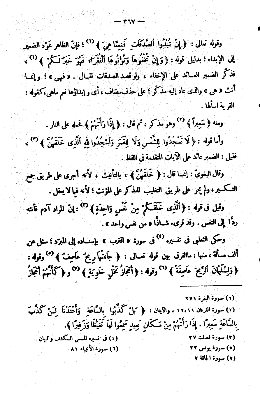 وَقَوْلُهُ تَعَالَى: {إِنْ تُبْدُوا الصَّدَقَاتِ فَنِعِمَّا هِيَ} ، فَإِنَّ الظَّاهِرَ عَوْدُ الضَّمِيرِ إِلَى الْإِبْدَاءِ بِدَلِيلِ قَوْلِهِ: {وَإِنْ تُخْفُوهَا وَتُؤْتُوهَا الْفُقَرَاءَ فَهُوَ خَيْرٌ لكم} ، فَذَكَّرَ الضَّمِيرَ الْعَائِدَ عَلَى الْإِخْفَاءِ وَلَوْ قَصَدَ الصَّدَقَاتِ لَقَالَ: [فَهِيَ] وَإِنَّمَا أَنَّثَ [هِيَ] وَالَّذِي عَادَ إِلَيْهِ مُذَكَّرٌ عَلَى حَذْفِ مُضَافٍ أَيْ وَإِبْدَاؤُهَا نِعْمَ مَا هِيَ كَقَوْلِهِ: الْقَرْيَةَ اسْأَلْهَا.