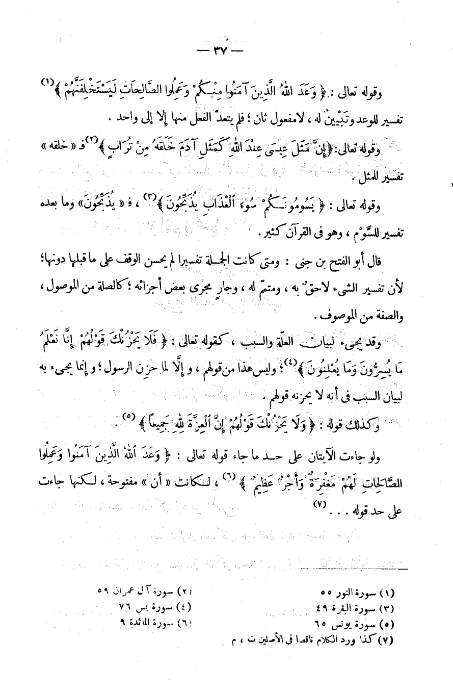 وَلَوْ جَاءَتِ الْآيَتَانِ عَلَى حَدِّ مَا جَاءَ قَوْلُهُ تَعَالَى: {وَعَدَ اللَّهُ الَّذِينَ آمَنُوا وَعَمِلُوا الصَّالِحَاتِ لَهُمْ مغفرة وأجر عظيم} ،لَكَانَتْ [أَنَّ] مَفْتُوحَةً، لَكِنَّهَا جَاءَتْ عَلَى حَدِّ قوله.....