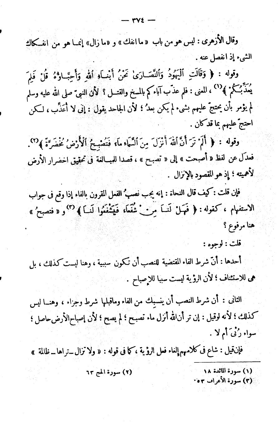 فَإِنْ قُلْتَ: كَيْفَ قَالَ النُّحَاةُ: إِنَّهُ يَجِبُ نَصْبُ الْفِعْلِ الْمَقْرُونِ بِالْفَاءِ إذا وقع في جواب الاستفهام، كَقَوْلِهِ: {فَهَلْ لَنَا مِنْ شُفَعَاءَ فَيَشْفَعُوا لَنَا} وَ [فَتُصْبِحُ] هُنَا مَرْفُوعٌ؟.