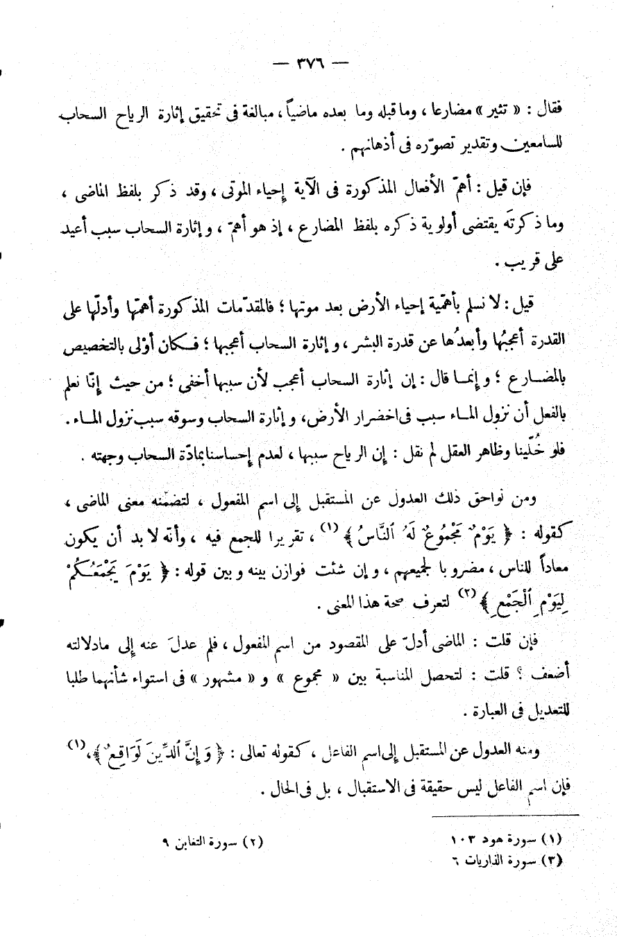 قِيلَ: لَا نُسَلِّمُ بِأَهَمِّيَّةِ إِحْيَاءِ الْأَرْضِ بَعْدَ مَوْتِهَا فَالْمُقَدَّمَاتُ الْمَذْكُورَةُ أَهَمُّهَا وَأَدَلُّهَا عَلَى الْقُدْرَةِ أَعْجَبُهَا وَأَبْعَدُهَا عَنْ قُدْرَةِ الْبَشَرِ وَإِثَارَةُ السَّحَابِ أَعْجَبُهَا فَكَانَ أَوْلَى بِالتَّخْصِيصِ بِالْمُضَارِعِ وَإِنَّمَا قَالَ: إِنَّ إِثَارَةَ السَّحَابِ أَعْجَبُ لِأَنَّ سَبَبَهَا أَخْفَى مِنْ حَيْثُ أَنَّا نَعْلَمُ بِالْفِعْلِ أَنَّ نُزُولَ الْمَاءِ سَبَبٌ فِي اخْضِرَارِ الْأَرْضِ وَإِثَارَةُ السَّحَابِ وَسَوْقُهُ سَبَبُ نُزُولِ الْمَاءِ.