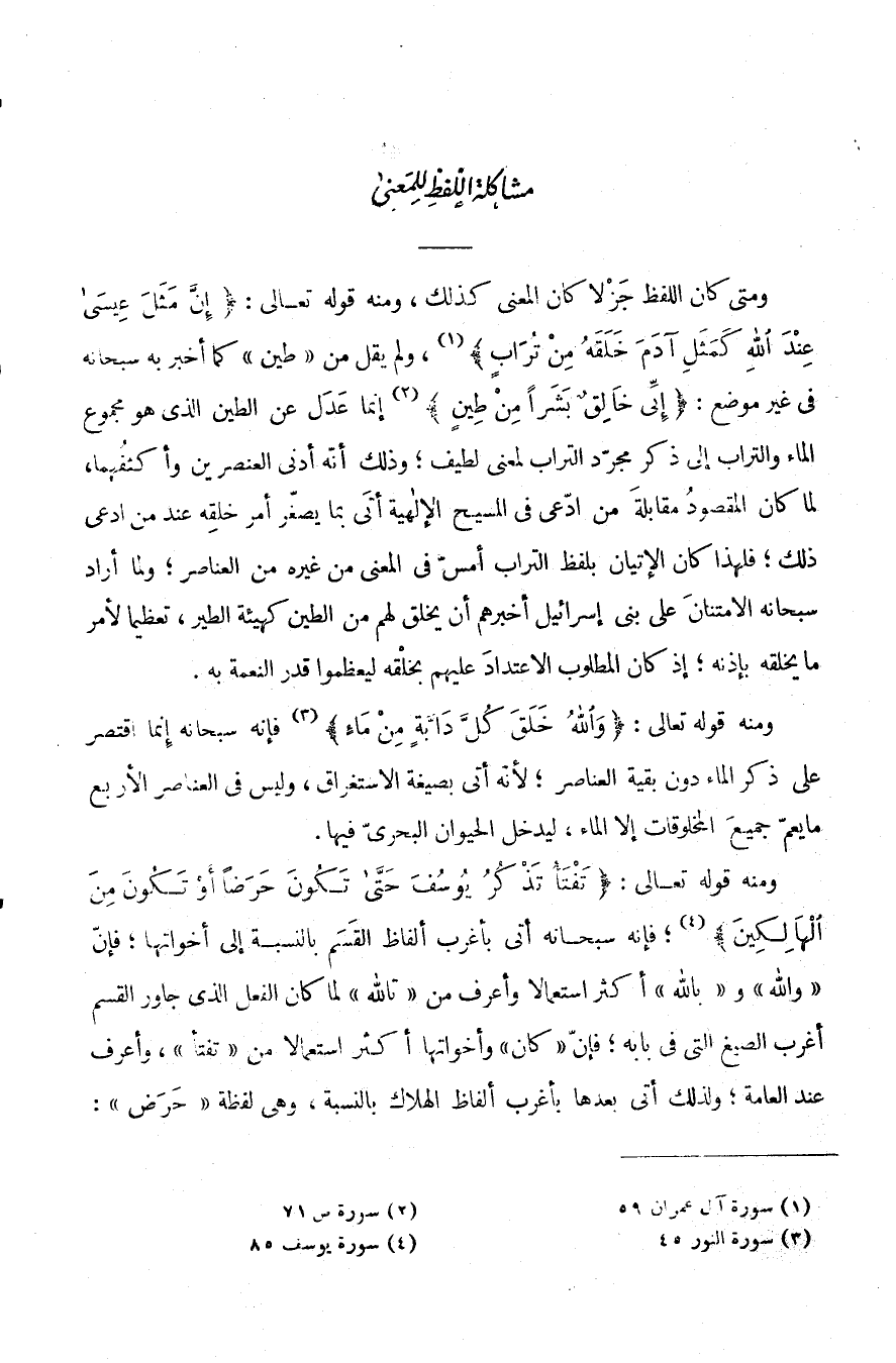 وَمَتَّى كَانَ اللَّفْظُ جَزْلًا كَانَ الْمَعْنَى كَذَلِكَ وَمِنْهُ قَوْلُهُ تَعَالَى: {إِنَّ مَثَلَ عِيسَى عِنْدَ اللَّهِ كَمَثَلِ آدَمَ خَلَقَهُ من تراب} ، وَلَمْ يَقُلْ مِنْ [طِينٍ] كَمَا أَخْبَرَ بِهِ سبحانه في غير موضع: {ني خالق بشرا من طين} إِنَّمَا عَدَلَ عَنِ الطِّينِ الَّذِي هُوَ مَجْمُوعُ الْمَاءِ وَالتُّرَابِ إِلَى ذِكْرِ مُجَرَّدِ التُّرَابِ لِمَعْنًى لَطِيفٍ وَذَلِكَ أَنَّهُ أَدْنَى الْعُنْصُرَيْنِ وَأَكْثَفُهُمَا لَمَّا كَانَ الْمَقْصُودُ مُقَابَلَةَ مَنِ ادَّعَى فِي الْمَسِيحِ الْإِلَهِيَّةَ أَتَى بِمَا يُصَغِّرُ أَمْرَ خَلْقِهِ عِنْدَ مَنِ ادَّعَى ذَلِكَ فَلِهَذَا كَانَ الْإِتْيَانُ بِلَفْظِ التُّرَابِ أَمَسَّ فِي الْمَعْنَى مِنْ غَيْرِهِ مِنَ الْعَنَاصِرِ وَلَمَّا أَرَادَ سُبْحَانَهُ الِامْتِنَانَ عَلَى بَنِي إسرائيل أخبرهم أن يَخْلُقُ لَهُمْ مِنَ الطِّينِ كَهَيْئَةِ الطَّيْرِ تَعْظِيمًا لأمر ما يخلقه بإذنه إذ كان الْمَطْلُوبُ الِاعْتِدَادَ عَلَيْهِمْ بِخَلْقِهِ لِيُعَظِّمُوا قَدْرَ النِّعْمَةِ بِهِ.
