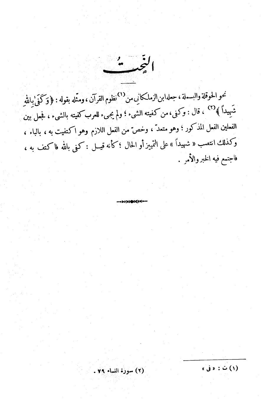 نَحْوَ الْحَوْقَلَةِ وَالْبَسْمَلَةِ، جَعَلَهُ ابْنُ الزَّمْلَكَانِيِّ مِنْ1 نُظُومِ الْقُرْآنِ وَمَثَّلَهُ بِقَوْلِهِ: {وَكَفَى بِاللَّهِ شهيدا} ، قال: وكفى من كفتيه الشيء ولم يجيء للعرب كفتيه بِالشَّيْءِ فَجَعَلَ بَيْنَ الْفِعْلَيْنِ الْفِعْلَ الْمَذْكُورَ وَهُوَ مُتَعَدٍّ وَخَصَّ مِنَ الْفِعْلِ اللَّازِمِ وَهُوَ اكْتَفَيْتُ بِهِ بِالْبَاءِ وَكَذَلِكَ انْتَصَبَ [شَهِيدًا] عَلَى التَّمْيِيزِ أَوِ الْحَالِ كَأَنَّهُ قِيلَ: كَفَى بِاللَّهِ فَاكْتَفِ بِهِ فَاجْتَمَعَ فِيهِ الْخَبَرُ وَالْأَمْرُ.