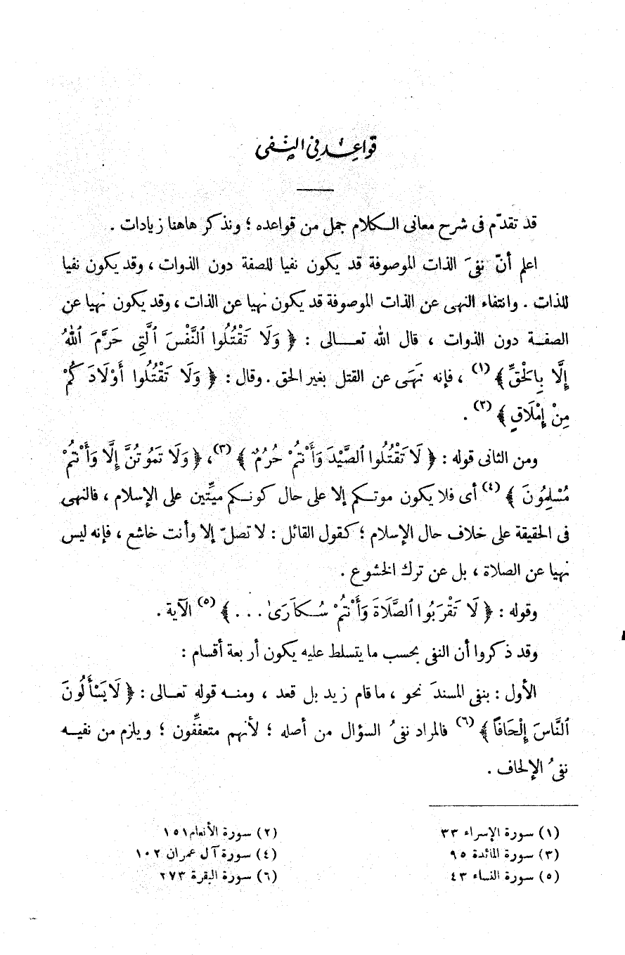 اعْلَمْ أَنَّ نَفْيَ الذَّاتِ الْمَوْصُوفَةِ قَدْ يَكُونُ نَفْيًا لِلصِّفَةِ دُونَ الذَّاتِ، وَقَدْ يَكُونُ نَفْيًا لِلذَّاتِ. وَانْتِفَاءُ النَّهْيِ عَنِ الذَّاتِ الْمَوْصُوفَةِ قَدْ يَكُونُ نَهْيًا عَنِ الذَّاتِ وَقَدْ يَكُونُ نَهْيًا عَنِ الصِّفَةِ دُونَ الذَّوَاتِ قَالَ اللَّهُ تَعَالَى: {وَلَا تَقْتُلُوا النَّفْسَ الَّتِي حَرَّمَ اللَّهُ إلا بالحق} فَإِنَّهُ نَهَى عَنِ الْقَتْلِ بِغَيْرِ الْحَقِّ. وَقَالَ: {ولا تقتلوا أولادكم من إملاق} .