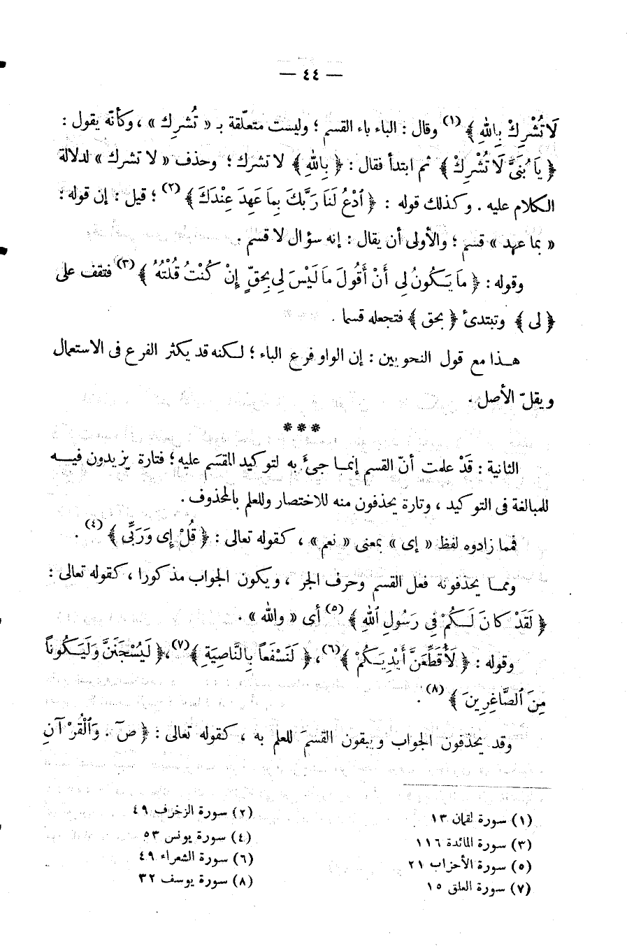 لا تشرك بالله} وَقَالَ: الْبَاءُ بَاءُ الْقَسَمِ، وَلَيْسَتْ مُتَعَلِّقَةً بِـ[تُشْرِكْ] وَكَأَنَّهُ يَقُولُ: {يَا بُنَيَّ لَا تُشْرِكْ} ثُمَّ ابْتَدَأَ فَقَالَ: {بِاللَّهِ} لَا تُشْرِكْ وَحَذَفَ {لَا تُشْرِكْ} لِدَلَالَةِ الْكَلَامِ عَلَيْهِ: وَكَذَلِكَ قَوْلُهُ: {ادع لنا ربك بما عهد عندك} قِيلَ: إِنَّ قَوْلَهُ: [بِمَا عَهِدَ] قَسَمٌ وَالْأَوْلَى أَنْ يُقَالَ: إِنَّهُ سُؤَالٌ لَا قَسَمٌ.