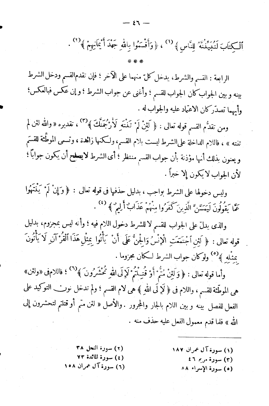 وَالَّذِي يَدُلُّ عَلَى الْجَوَابِ لِلْقَسَمِ لَا لِلشَّرْطِ دُخُولُ اللَّامِ فِيهِ وَأَنَّهُ لَيْسَ بِمَجْزُومٍ بِدَلِيلِ قَوْلِهِ تَعَالَى: {لَئِنِ اجْتَمَعَتِ الْإِنْسُ وَالْجِنُّ عَلَى أَنْ يَأْتُوا بِمِثْلِ هَذَا الْقُرْآنِ لَا يَأْتُونَ بِمِثْلِهِ} وَلَوْ كَانَ جَوَابُ الشَّرْطِ لَكَانَ مَجْزُومًا.