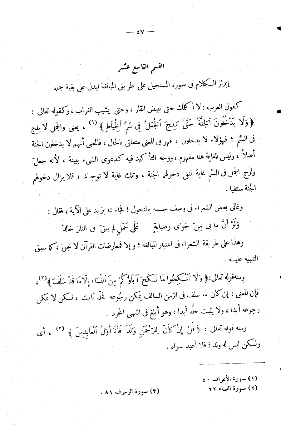 الْقِسْمُ التَّاسِعَ عَشَرَ: إِبْرَازُ الْكَلَامِ فِي صُورَةِ الْمُسْتَحِيلِ عَلَى طَرِيقِ الْمُبَالَغَةِ لِيَدُلَّ عَلَى بَقِيَّةِ جُمَلِهِ.