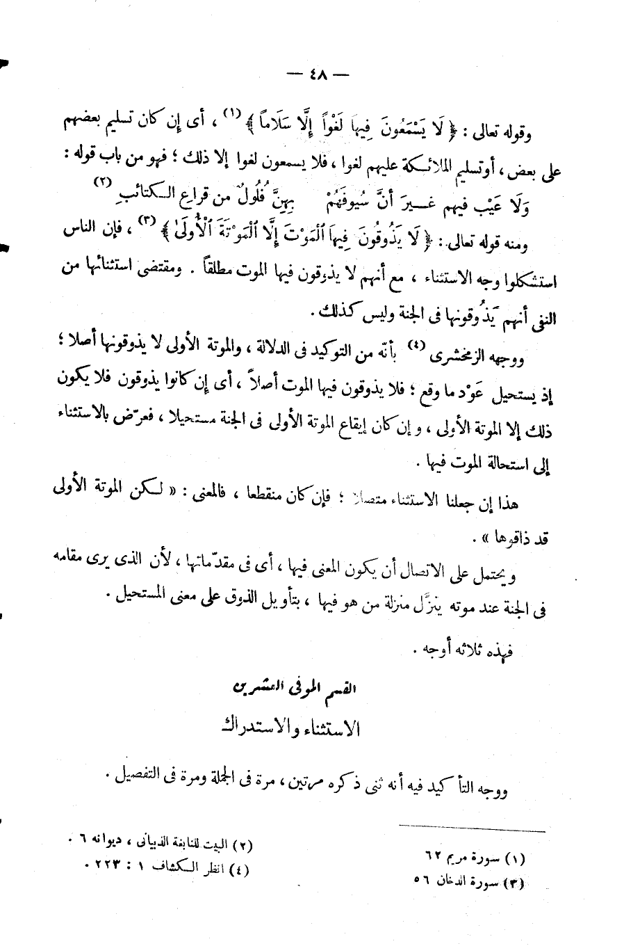 وَوَجَّهُهُ الزَّمَخْشَرِيُّ: بِأَنَّهُ مِنَ التَّوْكِيدِ فِي الدَّلَالَةِ وَالْمَوْتَةُ الْأُولَى لَا يَذُوقُونَهَا أَصْلًا إِذْ يَسْتَحِيلُ عَوْدُ مَا وَقَعَ فَلَا يَذُوقُونَ فِيهَا الْمَوْتَ أَصْلًا أَيْ إِنْ كَانُوا يَذُوقُونَ فَلَا يَكُونُ ذَلِكَ إِلَّا الْمَوْتَةَ الْأُولَى وَإِنْ كَانَ إِيقَاعُ الْمَوْتَةِ الْأُولَى فِي الْجَنَّةِ مُسْتَحِيلًا فَعَرَّضَ بِالِاسْتِثْنَاءِ إِلَى اسْتِحَالَةِ الْمَوْتِ فِيهَا.