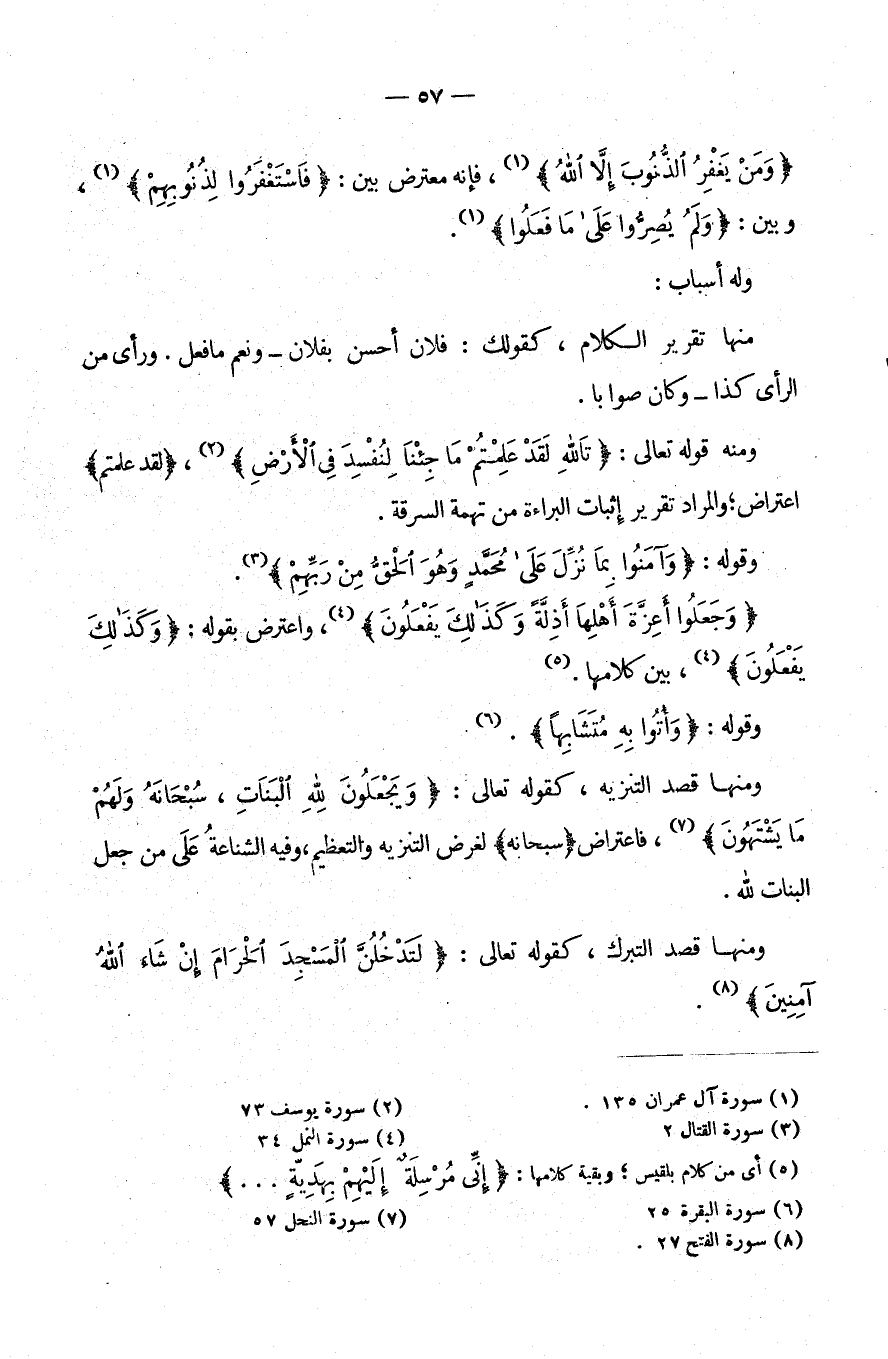 وَمِنْهُ قَوْلُهُ تَعَالَى: {تَاللَّهِ لَقَدْ عَلِمْتُمْ مَا جِئْنَا لِنُفْسِدَ فِي الأرض} لَقَدْ عَلِمْتُمْ اعْتِرَاضٌ وَالْمُرَادُ تَقْرِيرُ إِثْبَاتِ الْبَرَاءَةِ مِنْ تُهْمَةِ السَّرِقَةِ.
