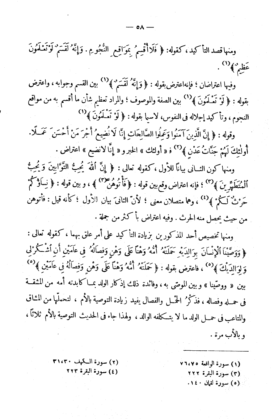 وَمِنْهَا: تَخْصِيصُ أَحَدِ الْمَذْكُورَيْنِ بِزِيَادَةِ التَّأْكِيدِ عَلَى أَمْرٍ عُلِّقَ بِهِمَا، كَقَوْلِهِ تَعَالَى: {وَوَصَّيْنَا الْإِنْسَانَ بِوَالِدَيْهِ حَمَلَتْهُ أُمُّهُ وَهْنًا عَلَى وَهْنٍ وَفِصَالُهُ فِي عامين أن اشكر لي ولوالديك إلي المصير} ، فَاعْتَرَضَ بِقَوْلِهِ: {حَمَلَتْهُ أُمُّهُ وَهْنًا عَلَى وَهْنٍ وفصاله في عامين} بَيْنَ [وَوَصَّيْنَا] وَبَيْنَ الْمُوصَى بِهِ، وَفَائِدَةُ ذَلِكَ إِذْكَارُ الْوَلَدِ بِمَا كَابَدَتْهُ أُمُّهُ مِنَ الْمَشَقَّةِ فِي حَمْلِهِ وَفِصَالِهِ فَذِكْرُ الْحَمْلِ وَالْفِصَالِ يُفِيدُ زِيَادَةَ التَّوْصِيَةِ بِالْأُمِّ لِتَحَمُّلِهَا مِنَ الْمَشَاقِّ وَالْمَتَاعِبِ فِي حَمْلِ الْوَلَدِ مَا لَا يَتَكَلَّفُهُ الْوَالِدُ وَلِهَذَا جَاءَ فِي الْحَدِيثِ التَّوْصِيَةُ بِالْأُمِّ ثَلَاثًا وبالأب مرة.