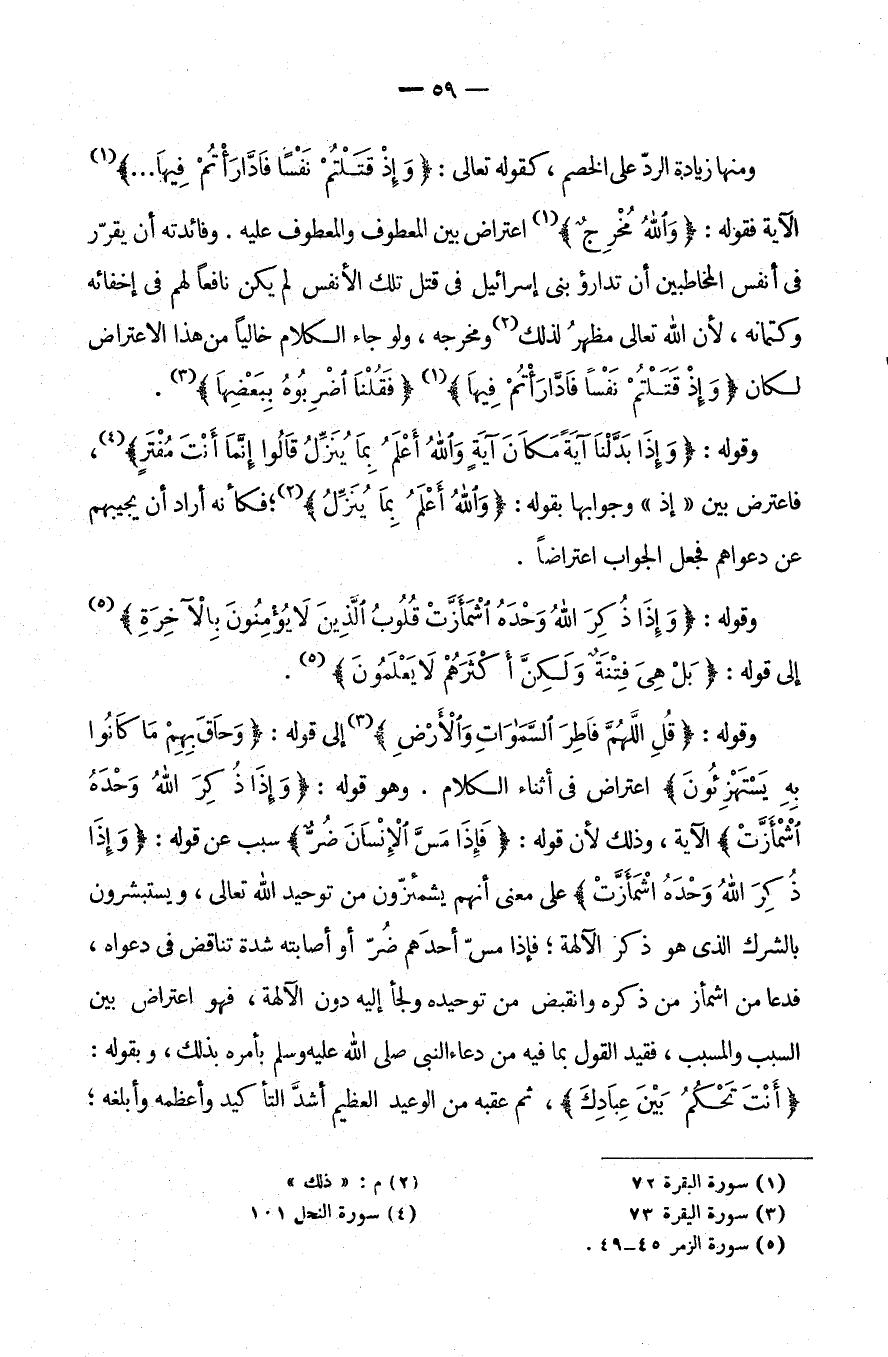 وَمِنْهَا: زِيَادَةُ الرَّدِّ عَلَى الْخَصْمِ، كَقَوْلِهِ تَعَالَى: {وإذ قتلتم نفسا فادارأتم فيها} الآية. فقوله: {والله مخرج} اعْتِرَاضٌ بَيْنَ الْمَعْطُوفِ وَالْمَعْطُوفِ عَلَيْهِ. وَفَائِدَتُهُ أَنْ يُقَرِّرَ فِي أَنْفُسِ الْمُخَاطَبِينَ أَنَّ تَدَارُؤَ بَنِي إِسْرَائِيلَ فِي قَتْلِ تِلْكَ الْأَنْفُسِ لَمْ يَكُنْ نَافِعًا لَهُمْ فِي إِخْفَائِهِ وَكِتْمَانِهِ لِأَنَّ اللَّهَ تَعَالَى مُظْهِرٌ لِذَلِكَ وَمُخْرِجُهُ وَلَوْ جَاءَ الْكَلَامُ خَالِيًا مِنْ هَذَا الِاعْتِرَاضِ لَكَانَ {وَإِذْ قَتَلْتُمْ نفسا فادارأتم فيها} {فقلنا اضربوه ببعضها} .