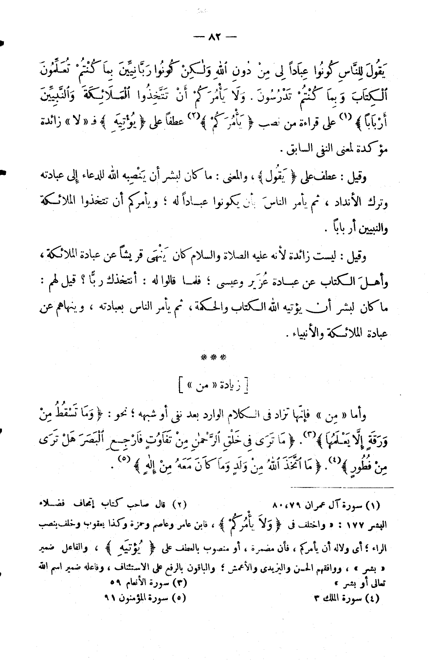 يَقُولَ لِلنَّاسِ كُونُوا عِبَادًا لِي مِنْ دُونِ اللَّهِ وَلَكِنْ كُونُوا رَبَّانِيِّينَ بِمَا كُنْتُمْ تُعَلِّمُونَ الْكِتَابَ وَبِمَا كُنْتُمْ تَدْرُسُونَ. وَلَا يَأْمُرَكُمْ أَنْ تتخذوا الملائكة والنبيين أربابا} عَلَى قِرَاءَةِ مَنْ نَصَبَ {يَأْمُرَكُمْ} عَطْفًا عَلَى {يُؤْتِيَهُ} فَـ[لَا] زَائِدَةٌ مُؤَكِّدَةٌ لِمَعْنَى النَّفْيِ السَّابِقِ.