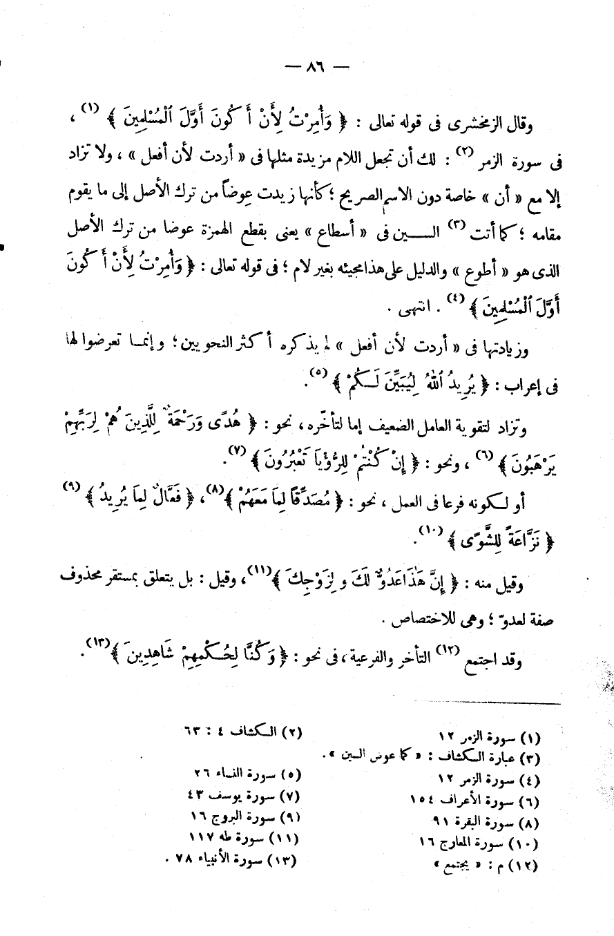 وَقَالَ الزَّمَخْشَرِيُّ فِي قَوْلِهِ تَعَالَى: {وَأُمِرْتُ لِأَنْ أكون أول المسلمين} ،فِي سُورَةِ الزُّمَرِ: لَكَ أَنْ تَجْعَلَ اللَّامَ مَزِيدَةً مِثْلَهَا فِي [أَرَدْتُ لِأَنْ أَفْعَلَ] وَلَا تُزَادُ إِلَّا مَعَ [أَنْ] خَاصَّةً دُونَ الِاسْمِ الصَّرِيحِ كَأَنَّهَا زِيدَتْ عِوَضًا مِنْ تَرْكِ الْأَصْلِ إِلَى مَا يَقُومُ مَقَامَهُ، كَمَا أَتَتِ السِّينُ فِي [أَسْطَاعَ] يَعْنِي بِقَطْعِ الْهَمْزَةِ عِوَضًا مِنْ تَرْكِ الْأَصْلِ الَّذِي هُوَ [أَطُوعُ] وَالدَّلِيلُ عَلَى هَذَا مَجِيئُهُ بِغَيْرِ لَامٍ، فِي قَوْلِهِ تَعَالَى: {وأمرت أن أكون من المسلمين} . انْتَهَى.