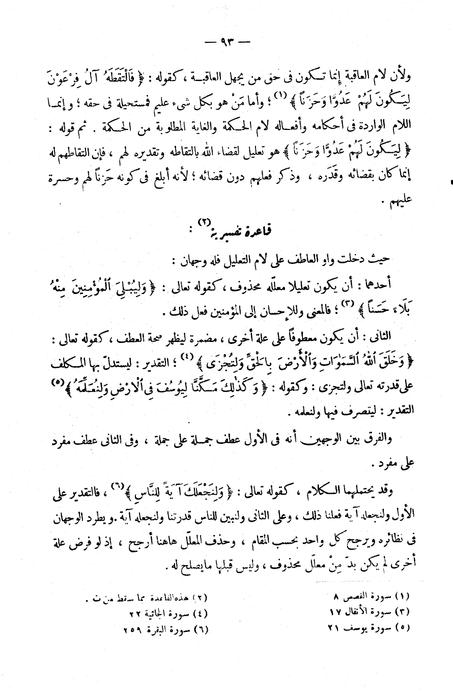 الثَّانِي: أَنْ يَكُونَ مَعْطُوفًا عَلَى عِلَّةٍ أُخْرَى مُضْمَرَةٍ لِيُظْهِرَ صِحَّةَ الْعَطْفِ كَقَوْلِهِ تَعَالَى: {وَخَلَقَ اللَّهُ السماوات والأرض بالحق ولتجزى} ، التَّقْدِيرُ: لِيَسْتَدِلَّ بِهَا الْمُكَلَّفُ عَلَى قُدْرَتِهِ تَعَالَى وَلِتُجْزَى. وَكَقَوْلِهِ: {وَكَذَلِكَ مَكَّنَّا لِيُوسُفَ فِي الْأَرْضِ ولنعلمه} ، التَّقْدِيرُ: لِيَتَصَرَّفَ فِيهَا وَلِنُعَلِّمَهُ.