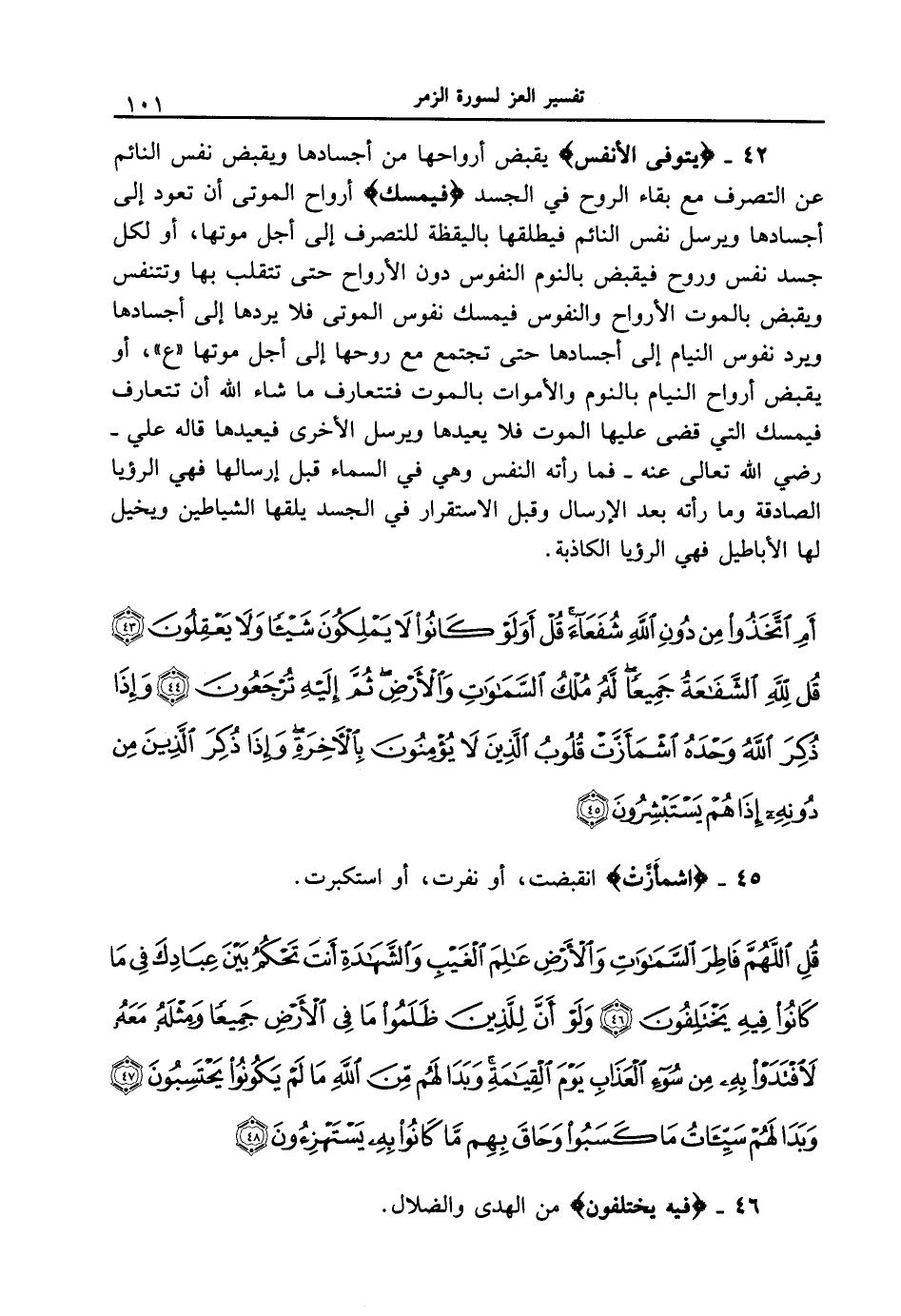 42 - {يَتَوَفَّى الأَنفُسَ} يقبض أرواحها من أجسادها ويقبض نفس النائم عن التصرف مع بقاء الروح في الجسد {فَيُمْسِكُ} أرواح الموتى أن تعود إلى أجسادها ويرسل نفس النائم فيطلقها باليقظة للتصرف إلى أجل موتها، أو لكل جسد نفس وروح فيقبض بالنوم النفوس دون الأرواح حتى تتقلب بها وتتنفس ويقبض بالموت الأرواح والنفوس فيمسك نفوس الموتى فلا يردها إلى أجسادها ويرد نفوس النيام إلى أجسادها حتى تجتمع مع روحها إلى أجل موتها " ع "، أو يقبض أرواح النيام بالنوم والأموات بالموت فتتعارف ما شاء الله أن تتعارف فيمسك التي قضى عليها الموت فلا يعديها ويرسل الأخرى فيعديها قاله علي - رضي الله عنه - فما رأته النفس وهي في السماء قبل إرسالها فهي الرؤيا الصادقة وما رأته بعد الإرسال وقبل الاستقرار في الجسد يلقها الشياطين ويخيل لها الأباطيل فهي الرؤيا الكاذبة.
