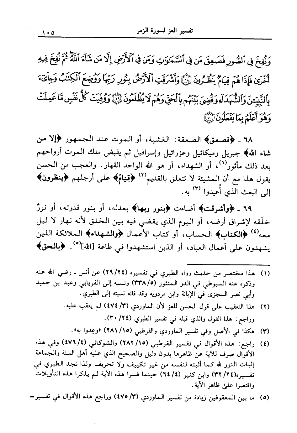 {وَنُفِخُ في الصور فصعق من في السموات والأرض إلا من شاء الله ثم نفخ فيه أخرى فإذا هم قيام ينظرون (68) وأشرقت الأرض بنور ربها ووضعَ الكتابُ وجائ بالنبيين والشهداء وقضي بينهم بالحق وهم لا يظلمون (69) ووفيت كل نفس ما عملت وهو أعلم بما يفعلون (70) }