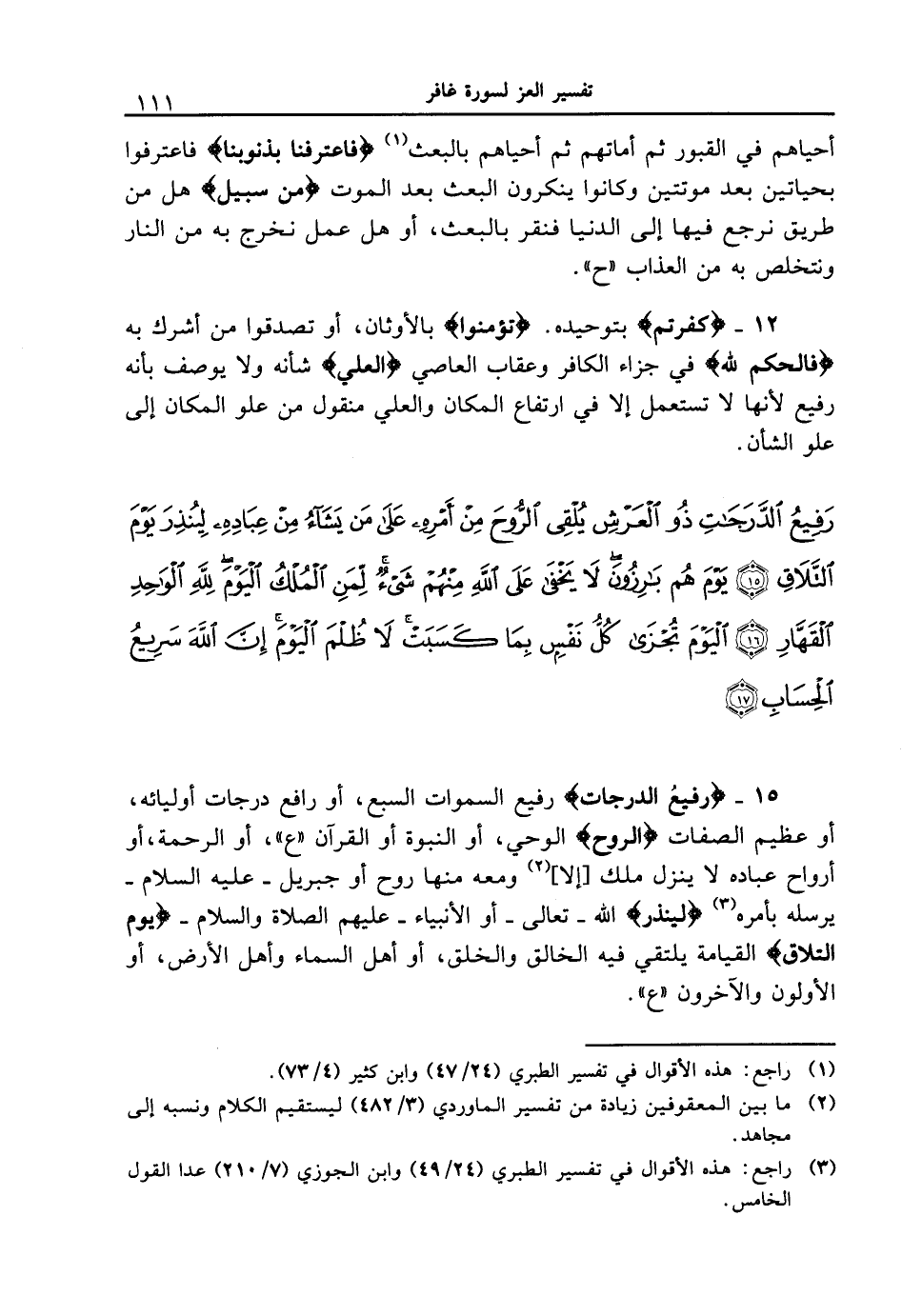 15 - {رَفِيعُ الدَّرَجَاتِ} رفيع السموات السبع، أو رافع درجات أوليائه، أو عظيم الصفات {الرُّوحَ} الوحي، أو النبوة أو القرآن " ع "، أو الرحمة، أو أرواح عباده لا ينزل ملك [إلا] ومعه منها روح أو جبريل - عليه السلام - يرسله بأمره {لِيُنذِرَ} الله - تعالى - أو الأنبياء -[صلى الله عليه وسلم]- {يَوْمَ التَّلاقِ} القيامة يلتقي فيه الخالق والخلق، أو أهل السماء وأهل الأرض، أو الأولون والآخرون " ع ".