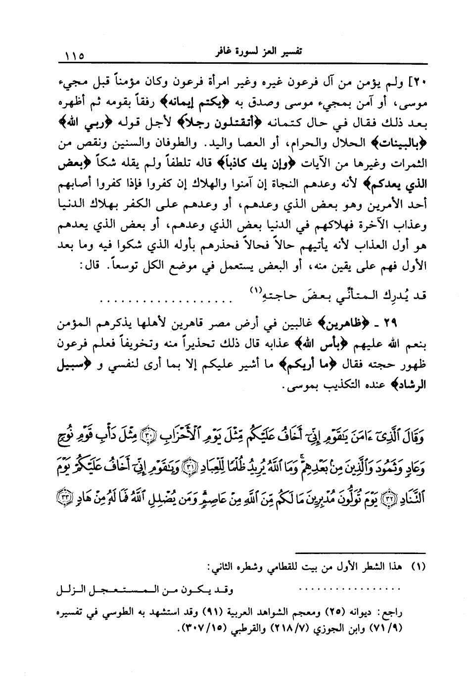 {وقال الذي ءامن ياقوم إني أخاف عليكم مثل يوم الأحزاب (30) مثل دأب قوم نوحٍ وعادٍ وثمود والذين من بعدهم وما الله يريد ظلماً للعباد (31) وياقوم إني أخاف عليكم يوم التناد (32) يوم تولون مدبرين ما لكم من الله من عاصم ومن يضلل الله فما له من هاد) }
