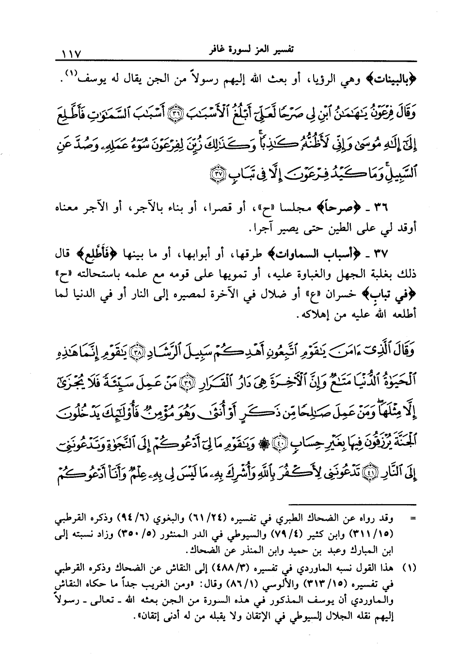 37 - {أَسْبَابَ السَّمَاوَاتِ} طرقها، أو أبوابها، أو ما بينها {فَأَطَّلِعَ} قال ذلك بغلبة الجهل والغباوة عليه، أو تمويها على قومه مع علمه باستحالته " ح " {فِى تَبَابٍ} خسران " ع " أو ضلال في الآخرة لمصيره إلى النار أو في الدنيا لما أطلعه الله عليه من إهلاكه.