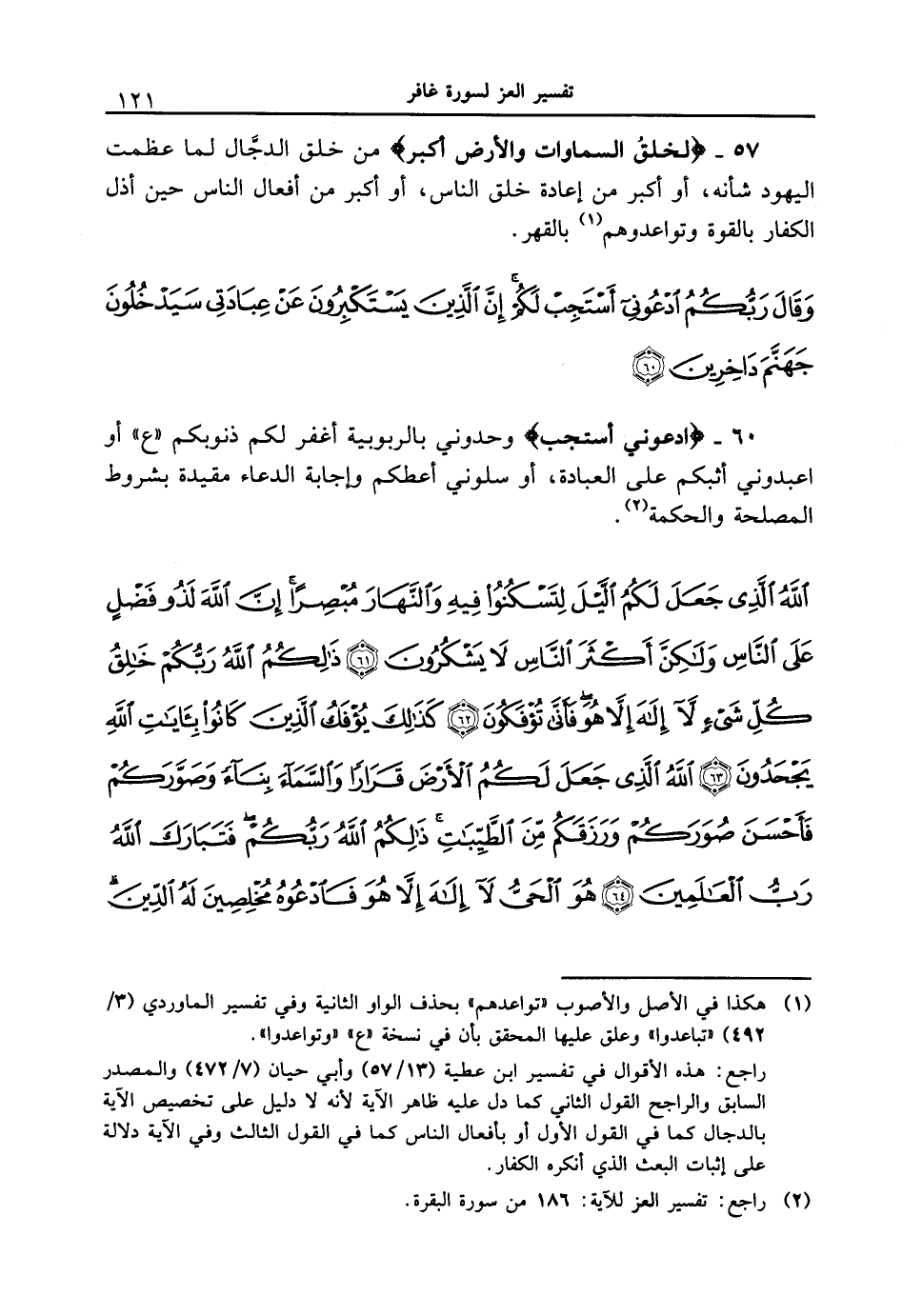 57 - {لَخَلْقُ الْسَّمَاوَاتِ وَالأَرْضِ أَكْبَرُ} من خلق الدجَّال لما عظمت اليهود شأنه، أو أكبر من إعادة خلق الناس، أو أكبر من أفعال الناس حين أذل الكفار بالقوة وتواعدوهم بالقهر.