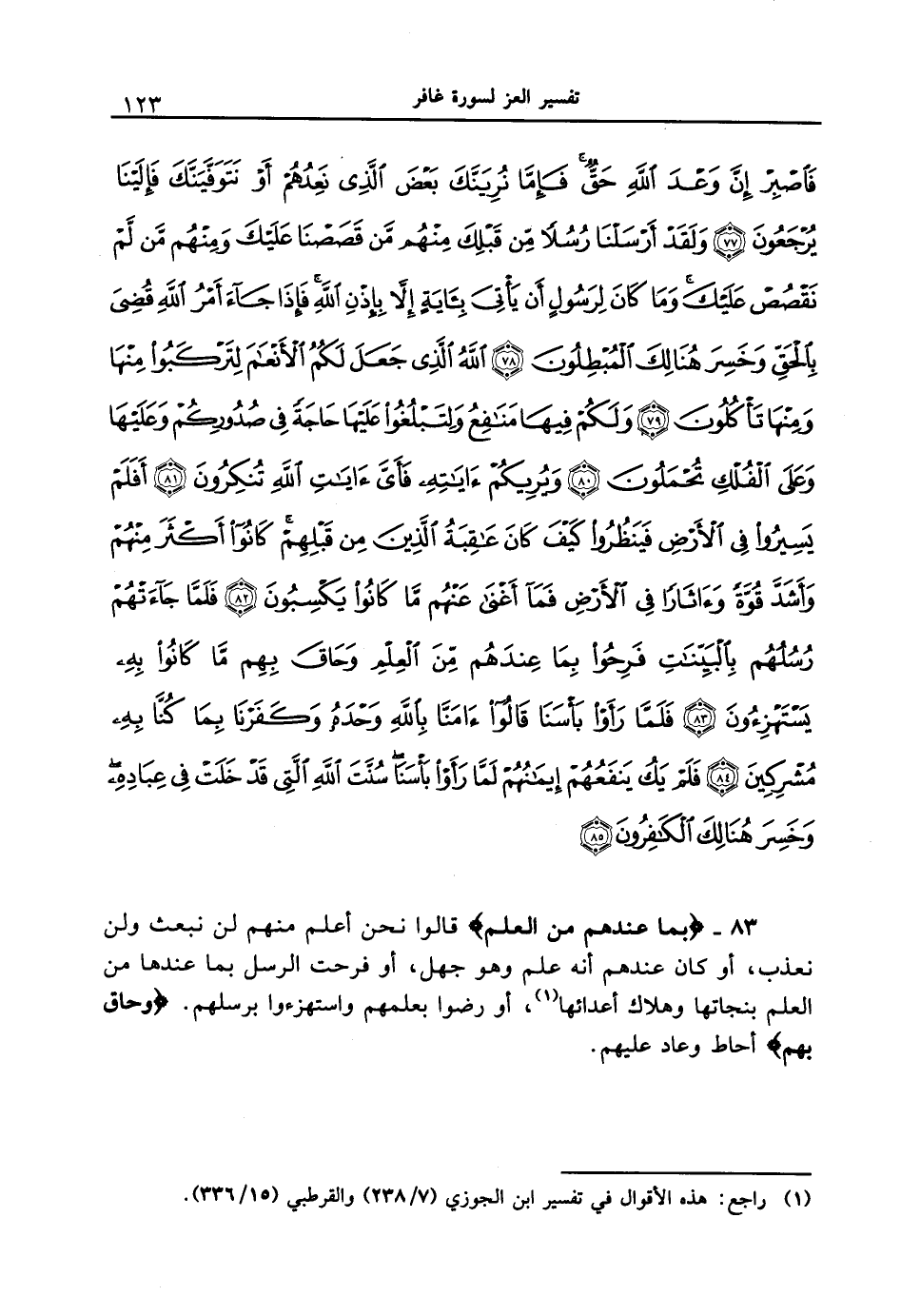 {فاصبر إن وعد الله حق فإما نرينك بعض الذين نعدهم أو نتوفينك فإلينا يرجعون (77) ولقد أرسلنا رسلاً من قبلك منهم من قصصنا عليك ومنهم من لم نقصص عليك وما كان لرسول أن يأتي بآية إلا بإذن الله فإذا جاء أمر الله قضيَ بالحق وخسرَ هنالك المبطلون (78) الله الذي جعل لكم الأنعام لتركبوا منها ومنها تأكلون (79) ولكم فيها منافع ولتبلغوا عليها حاجة في صدوركم وعليها وعلى الفلك تحملون (80) ويريكم ءاياته فأي ءاياتِ الله تنكرون (81) أفلم يسيروا في الأرض فينظروا كيف كان عاقبة الذين من قبلهم كانوا أكثر منهم وأشد قوة وءاثارا في الأرض فما أغنى عنهم ما كانوا يكسبون (82) فلما جاءتهم رسلهم بالبيناتِ فرحوا بما عندهم من العلم وحاق بهم ما كانوا به يستهزءون (83) فلما رأوا بأسنا قالوا ءامنا بالله وحده وكفرنا بما كنا به مشركين (84) فلم يك ينفعهم إيمانهم لما رأوا بأسنا سنت الله التي قد خلت في عباده وخسر هنالك الكافرون (85) }