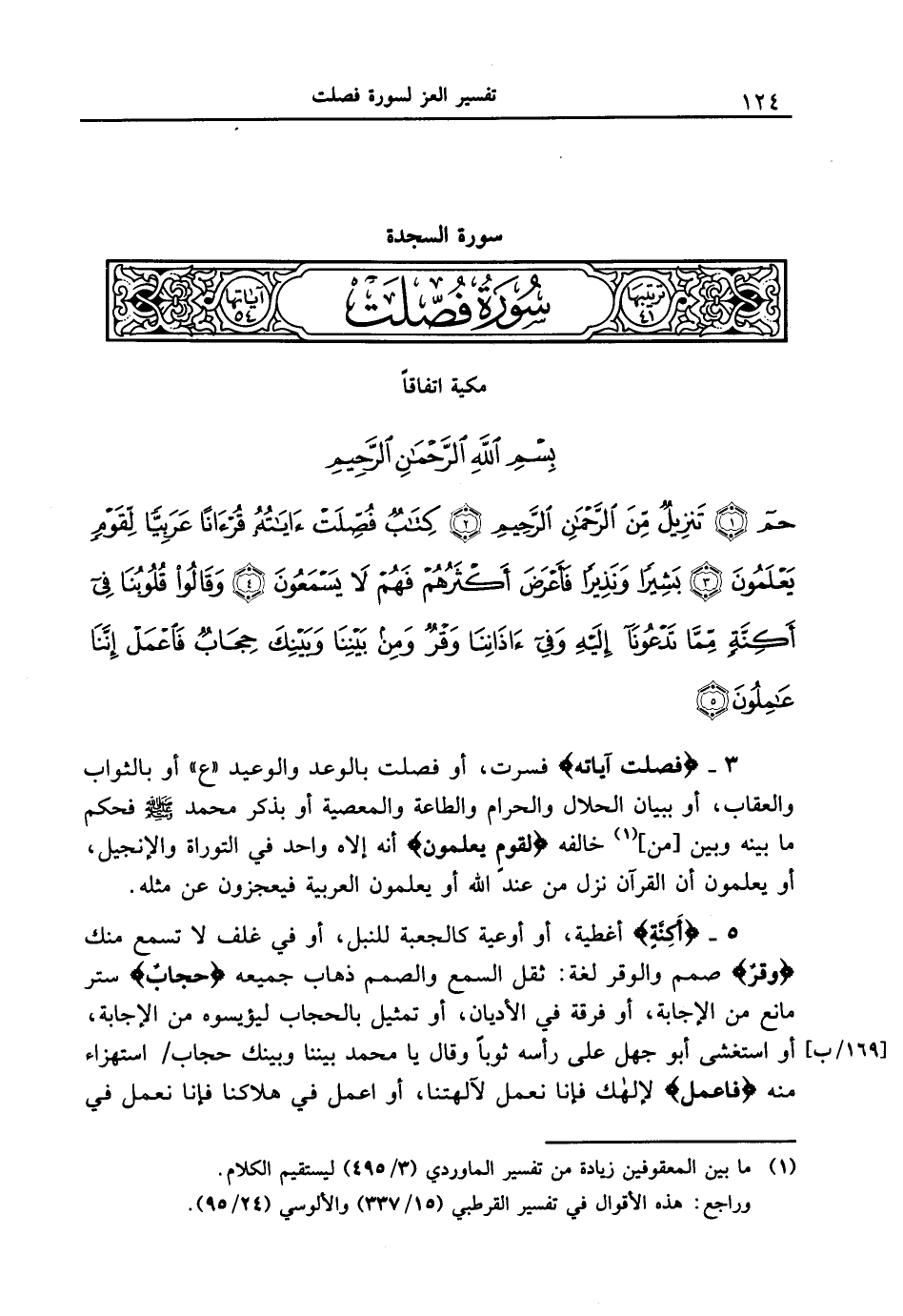 3 - {فصلت آياته} فُسِّرت، أو فُصِّلت بالوعد والوعيد " ع " أو بالثواب والعقاب، أو ببيان الحلال والحرام والطاعة والمعصية أو بذكر محمد [صلى الله عليه وسلم] فحكم ما بينه وبين [من] خالفه {لِّقَوْمٍ يَعْلَمُونَ} أنه إله واحد في التوراة والإنجيل، أو يعلمون أن القرآن نزل من عند الله أو يعلمون العربية فيعجزون عن مثله.