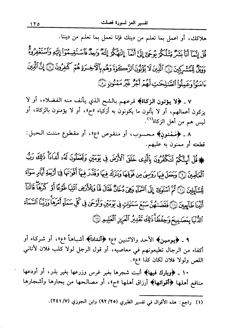 7 - {لا يؤتون الزكاة} تركهم بالشح الذي يأنف منه الفضلاء، أو لا يزكون أعمالهم، أو لا يأتون ما يكونون به أزكياء " ح "، أو لا يؤمنون بالزكاة، أو ليس هم من أهل الزكاة.