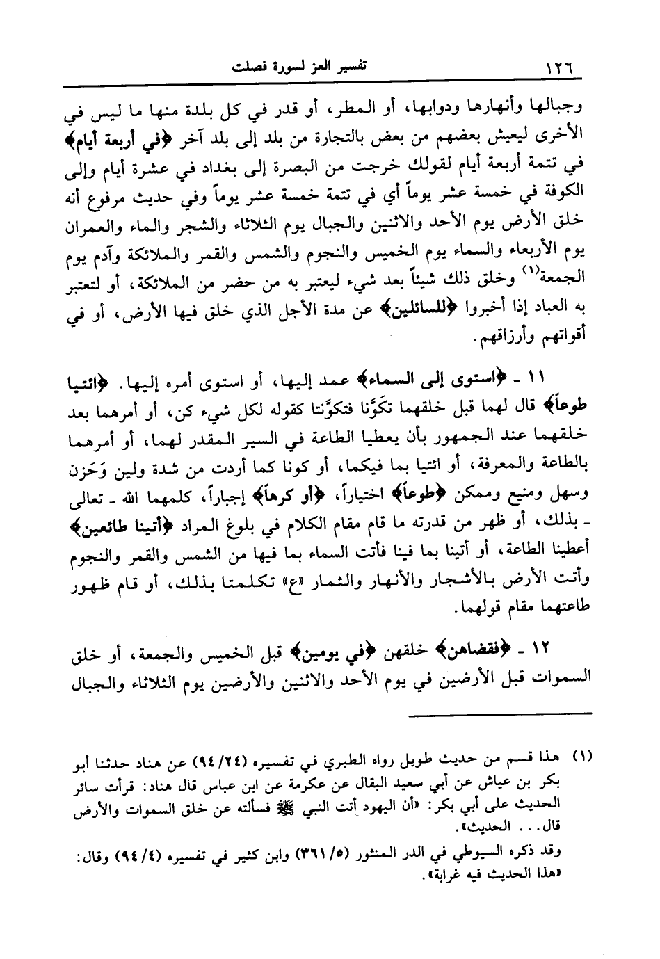 12 - {فَقَضَاهُنَّ} خلقهن {فِى يَوْمَيْنِ} قبل الخميس والجمعة، أو خلق السموات قبل الأرضين في يوم الأحد والأثنين والأرضين يوم الثلاثاء والجبال