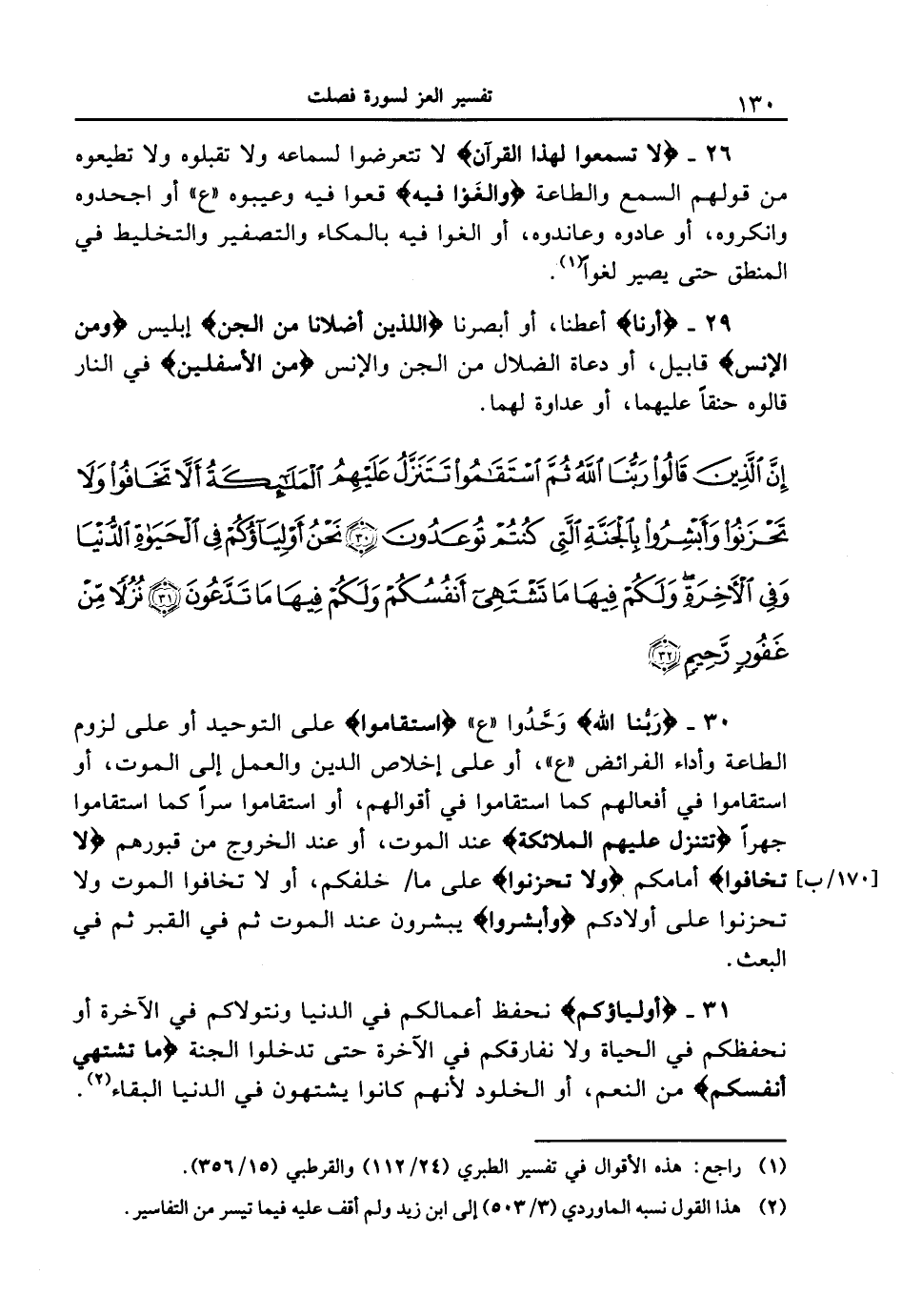 30 - {رَبُّنَا اللَّهُ} وَحَّدُوا " ع " {اسْتَقَامُواْ} على التوحيد أو على لزوم الطاعة وأداء الفرائض " ع "، أو على إخلاص الدين والعمل إلى الموت، أو استقاموا في أفعالهم كما استقاموا في أقوالهم، أو استقاموا سراً كما استقاموا جهراً {تَتَنَزَّلُ عَلَيْهِمُ الْمَلآئِكَةُ} عند الموت، أو عند الخروج من قبورهم {لا تخافوا} أمامكم {ولا تحزنوا} على ما [170 / ب] / خلفكم، أو لا تخافوا الموت ولا تحزنوا على أولادكم {وأبشروا} يبشرون عن الموت ثم في القبر ثم في البعث.