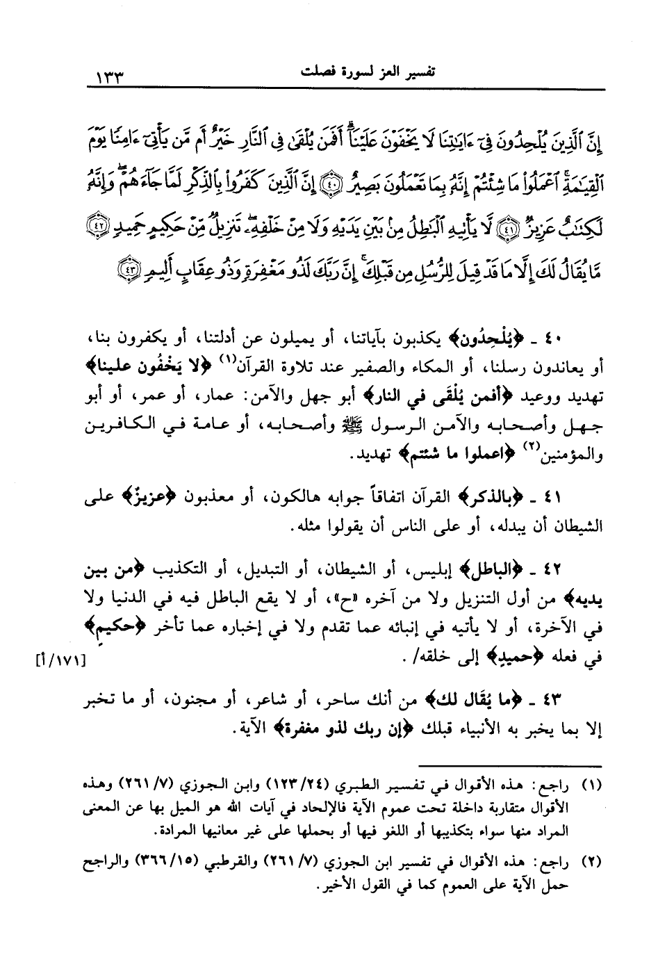 {إِنَّ الذين يُلحدون في ءاياتنا لا يخفون علينا أفمن يلقى في النار خيرٌ أم من يأتي ءامناً يومَ القيامة اعلموا ما شئتم إنه بما تعملون بصير (40) إن الذين كفروا بالذكر لما جاءهم وإنه لكتاب عزيزٌ (41) لاَّ يَأْتِيهِ الباطل مِن بَيْنِ يَدَيْهِ وَلاَ من خلفه تنزيلٌ من حكيم حميد (42) ما يقال لك إلا ما قيل للرسل من قبلك إن ربك لذو مغفرة وذو عقابٍ أليمٍ (43) }