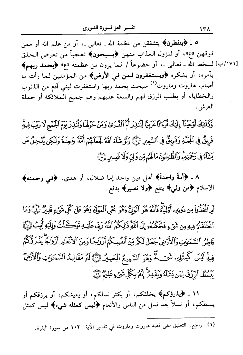 5 - {يَتَفَطَّرْنَ} يتشققن من عظمة الله - تعالى -، أو من علم الله أو ممن فوقهن " ع "، أو لنزول العذاب منهن {يُسَبِّحُونَ} تعجباً من تعرض الخلق لسخط الله - تعالى -، أو خضوعاً [171 / ب] / لما يرون من عظمته " ع " {بِحَمْدِ رَبِّهِمْ} بأمره، أو بشكره {وَيَسْتَغْفِرُونَ لِمَن فِى الأَرْضِ} من المؤمنين لما رأت ما أصاب هاروت وماروت سبحت بحمد ربها واستغفرت لبني آدم من الذنوب والخطايا، أو بطلب الرزق لهم والسعة عليهم وهم جميع الملائكة أو حملة العرش.
