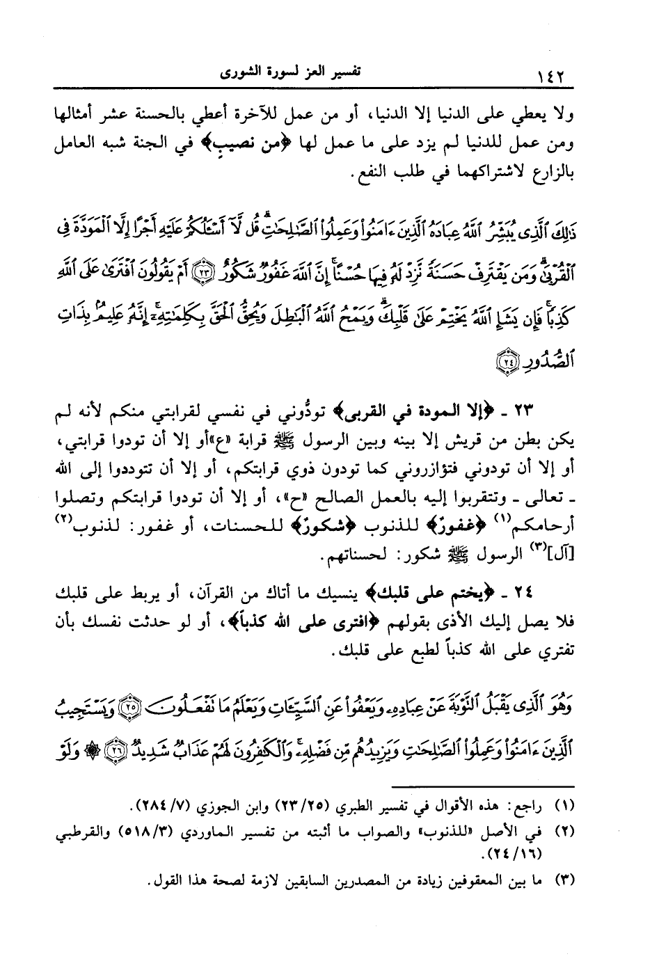 23 - {إِلا الْمَوَدَّةَ فِى الْقُرْبَى} تودُّوني في نفسي لقرابتي منكم لأنه لم يكن بطن من قريش إلا بينه وبين الرسول [صلى الله عليه وسلم] قرابة " ع " أو إلا أن تودوا قرابتي، أو إلا أن تودوني فتؤازروني كما تودون ذوي قرابتكم، أو إلا أن تتوددوا إلى الله - تعالى - وتتقربوا إليه بالعمل الصالح " ح "، أو إلا أن تودوا قرابتكم وتصلوا أرحامكم {غَفُورٌ} للذنوب {شَكُورٌ} للحسنات، أو غفور: لذنوب [آل] الرسول [صلى الله عليه وسلم] شكور: لحسناتهم.