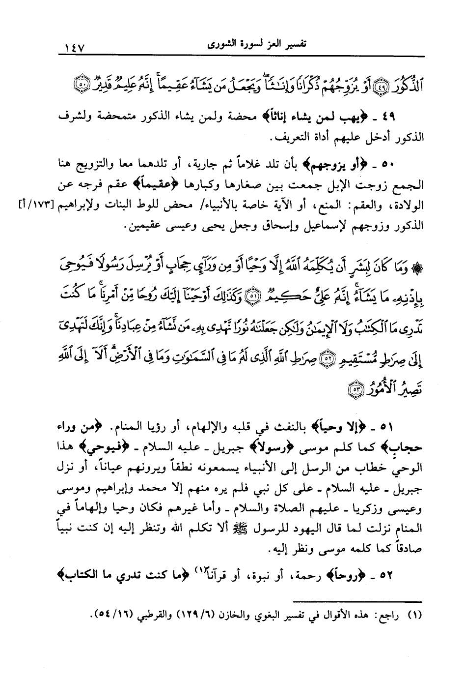 50 - {أَوْ يُزَوِّجُهُمْ} بأن تلد غلاماً ثم جارية، أو تلدهما معاً والتزويج هنا الجمع زوجت الإبل جمعت بين صغارها وكبارها {عَقِيماً} عقم فرجه عن الولادة، والعقم: المنع، أو الآية خاصة بالأنبياء [173 / أ] / محض للوط البنات ولإبراهيم الذكور وزوجهم لإسماعيل وإسحاق وجعل يحيى وعيسى عقيمين.
