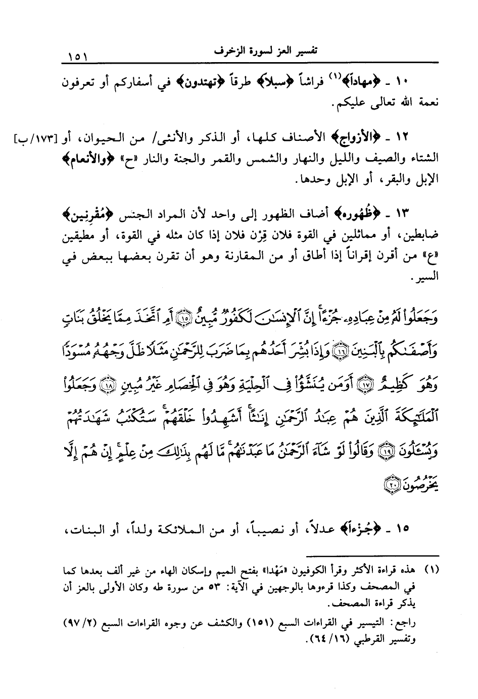 13 - {ظُهُورِهِ} أضاف الظهور إلى واحد لأن المراد الجنس {مُقْرِنِينَ} ضابطين، أو مماثلين في القوة فلان قِرْن فلان إذا كان مثله في القوة، أو مطيقين " ع " من أقرن إقراناً إذا أطاق أو من المقارنة وهو أن تقرن بعضها ببعض في السير.