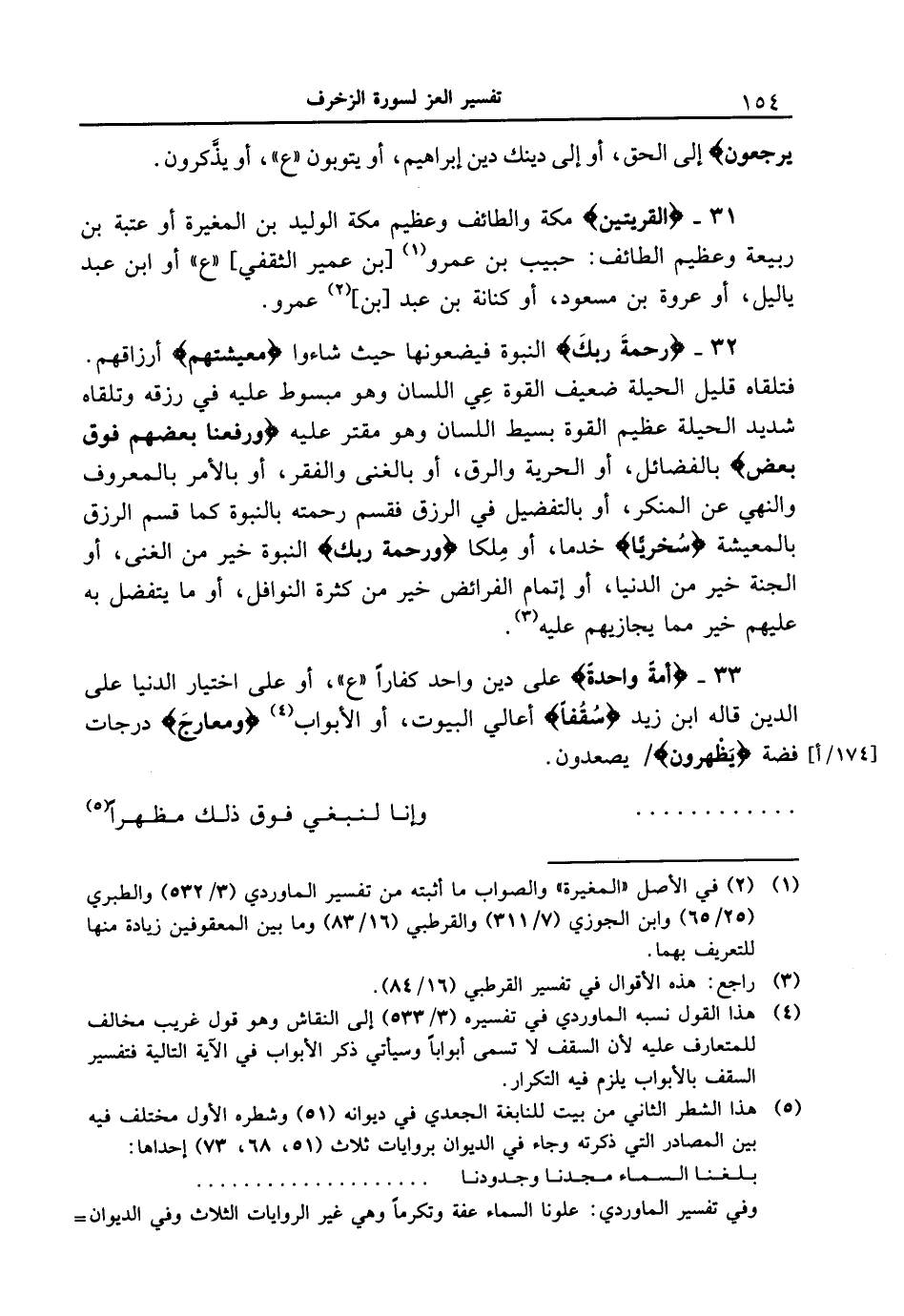 31 - {الْقَرْيَتَيْنِ} مكة والطائف وعظيم مكة الوليد بن المغيرة أو عتبة بن ربيعة وعظيم الطائف: حبيب بن عمرو [بن عمير الثقفي] " ع " أو ابن عبد ياليل، أو عروة بن مسعود، أو كنانة بن عبد [بن] عمرو.