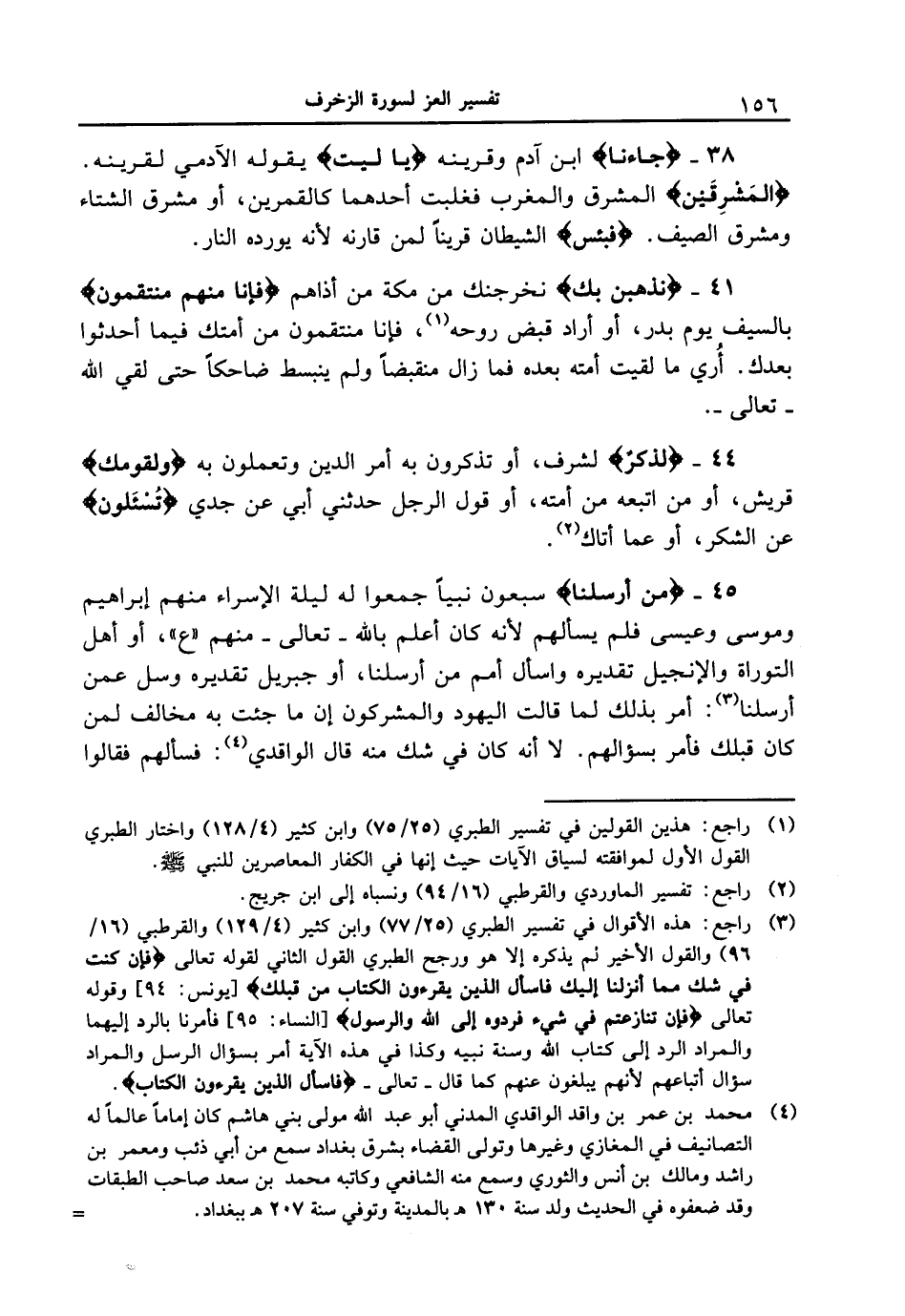 38 - {جاءنا} ابن آدم وقرينه {يا ليت} يقوله الآدمي لقرينه. {الْمَشْرِقَيْنِ} المشرق والمغرب فغلبت أحدهما كالقمرين، أو مشرق الشتاء ومشرق الصيف. {فَبِئْسَ} الشيطان قريناً لمن قارنه لأنه يورده النار.