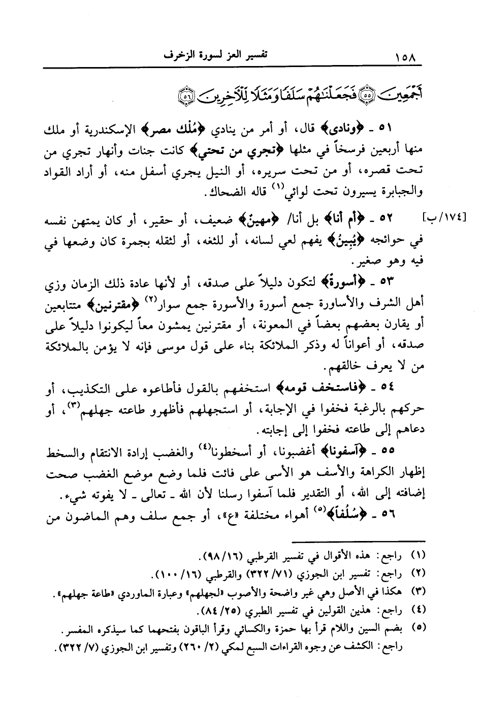 53 - {أسورةٌ} لتكون دليلاً على صدقه، أو لأنها عادة ذلك الزمان وزي أهل الشرف والأساورة جمع أسورة والأسورة جمع سوار {مُقْتَرِنِينَ} متتابعين أو يقارن بعضهم بعضاً في المعونة، أو مقترنين يمشون معاً ليكونوا دليلاً على صدقه، أو أعواناً له وذكر الملائكة بناء على قول موسى فإنه لا يؤمن بالملائكة من لا يعرف خالقهم.