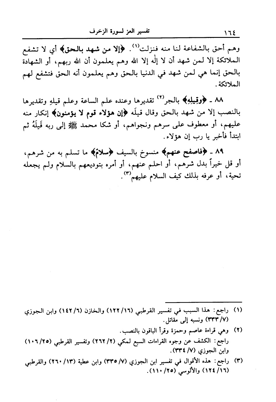88 - {وَقِيلِهِ} بالجر تقديرها وعنده علم الساعة وعلم قيلهِ وتقديرها بالنصب إلا من شهد بالحق وقال قيلَه {إِنَّ هَؤُلآءِ قَوْمٌ لا يُؤْمِنُونَ} إنكار منه عليهم، أو معطوف على سرهم ونجواهم، أو شكا محمد [صلى الله عليه وسلم] إلى ربه قَيلَهُ ثم ابتدأ فأخبر يا رب إن هؤلاء.