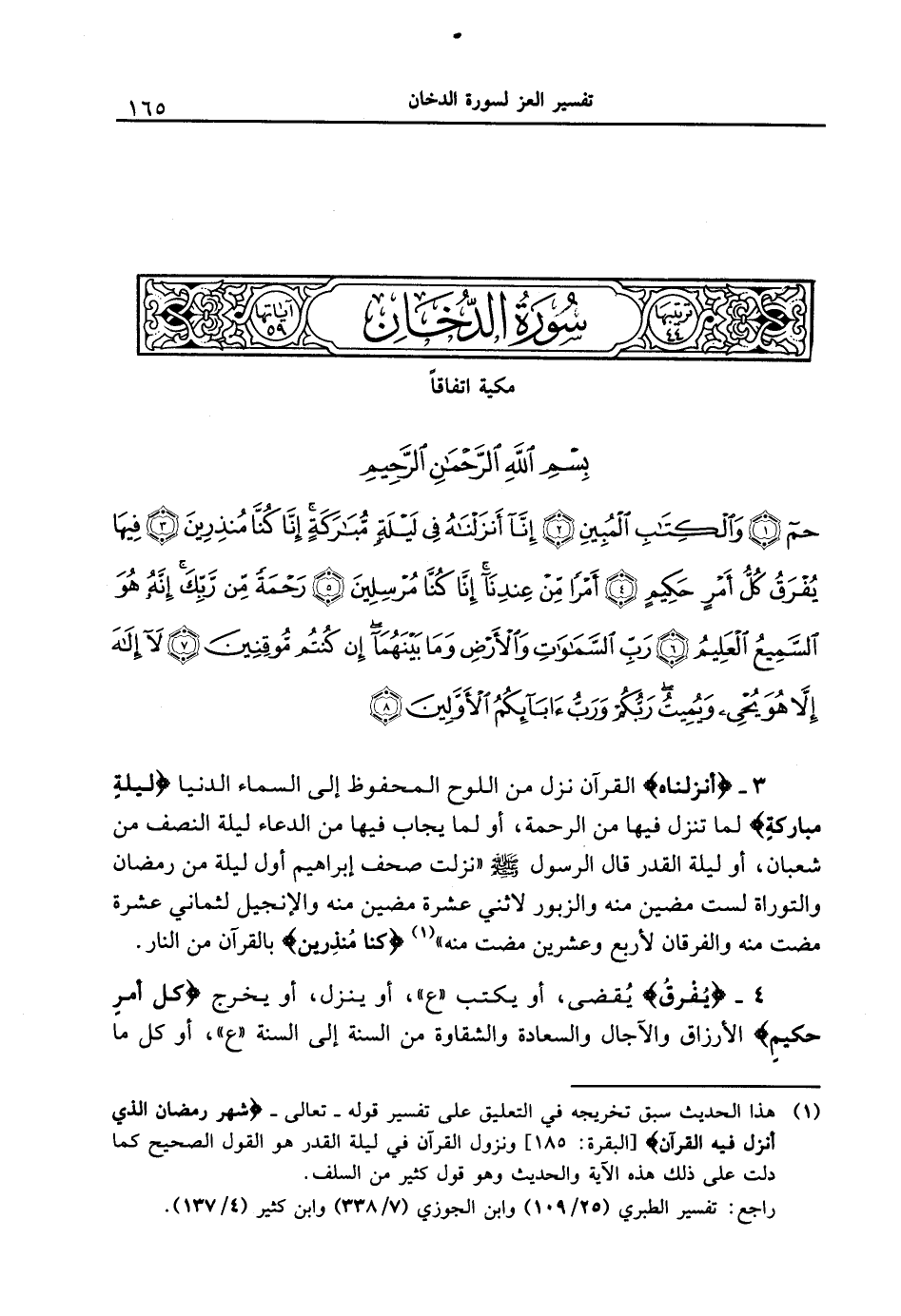 3 - {أَنزَلْنَاهُ} القرآن نزل من اللوح المحفوظ إلى السماء الدنيا {لَيْلَةٍ مُّبَارَكَةٍ} لما تنزل فيها من الرحمة، أو لما يجاب فيها من الدعاء ليلة النصف من شعبان، أو ليلة القدر قال الرسول [صلى الله عليه وسلم] " نزلت صحف إبراهيم أول ليلة من رمضان والتوراة لست مضين منه والزبور لاثني عشرة مضين منه والإنجيل لثماني عشرة مضت منه والفرقان لأربع وعشرين مضت منه " {كُنَّا مُنذِرِينَ} بالقرآن من النار.