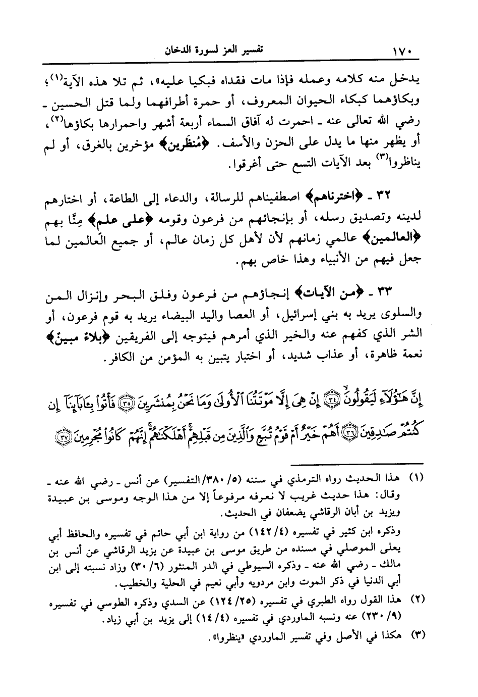 33 - {مِّنَ الأَيَاتِ} إنجاؤهم من فرعون وفلق البحر وإنزال المن والسلوى يريد به بني إسرائيل، أو العصا واليد البيضاء يريد به قوم فرعون، أو الشر الذي كفهم عنه والخير الذي أمرهم فيتوجه إلى الفريقين {بلاء مُّبِينٌ} نعمة ظاهرة، أو عذاب شديد، أو اختبار يتبين به المؤمن من الكافر.