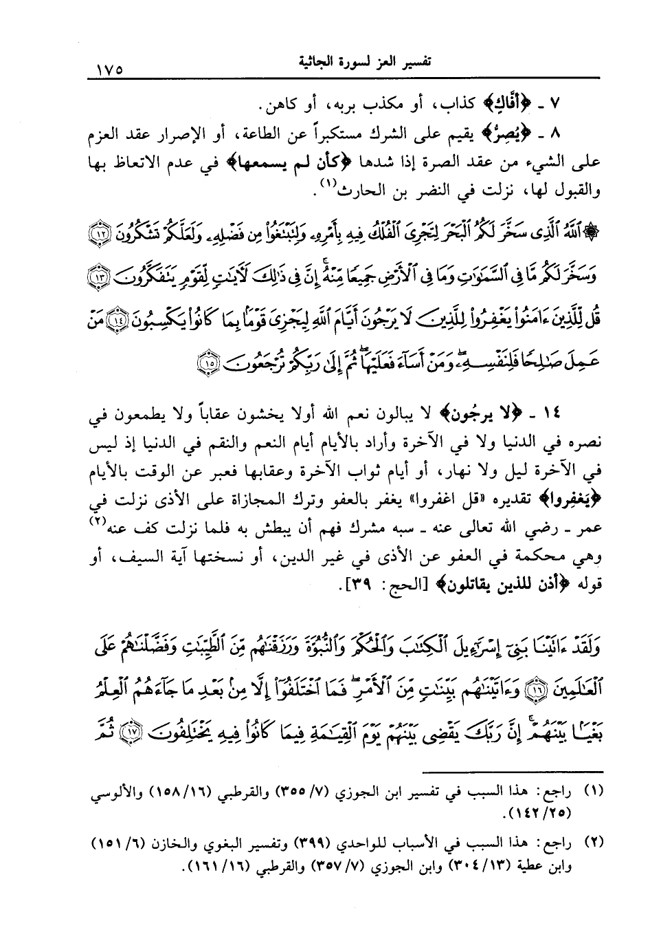 14 - {لا يرجون} لا يبالون نعم الله أولا يخشون عقاباً ولا يطعمون في نصره في الدنيا ولا في الآخرة وأراد بالأيام أيام النعم والنقم في الدنيا إذ ليس في الآخرة ليل ولا نهار، أو أيام ثواب الآخرة وعقابها فعبّر عن الوقت بالأيام {يَغْفِرُواْ} تقديره " قل اغفروا " يغفر بالعفو وترك المجازاة على الأذى نزلت في عمر - رضي الله تعالى عنه - سبّه مشرك فهمَّ أن يبطش به فلما نزلت كف عنه وهي محكمة في العفو عن الأذى في غير الدين، أو نسختها آية السيف، أو قوله {أذن للذين يقاتلون} [الحج: 39] .