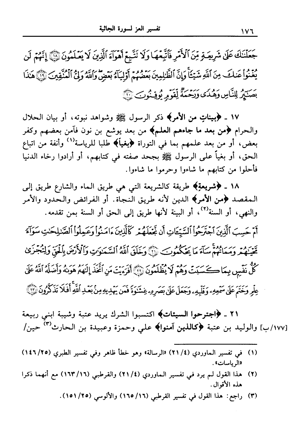 18 - {شريعةٍ} طريقة كالشريعة التي هي طريق الماء والشارع طريق إلى المقصد {مِّنَ الأَمْرِ} الدين لأنه طريق النجاة. أو الفرائض والحدود والأمر والنهي، أو السنة، أو البينة لأنها طريق إلى الحق أو السنة بمن تقدمه.