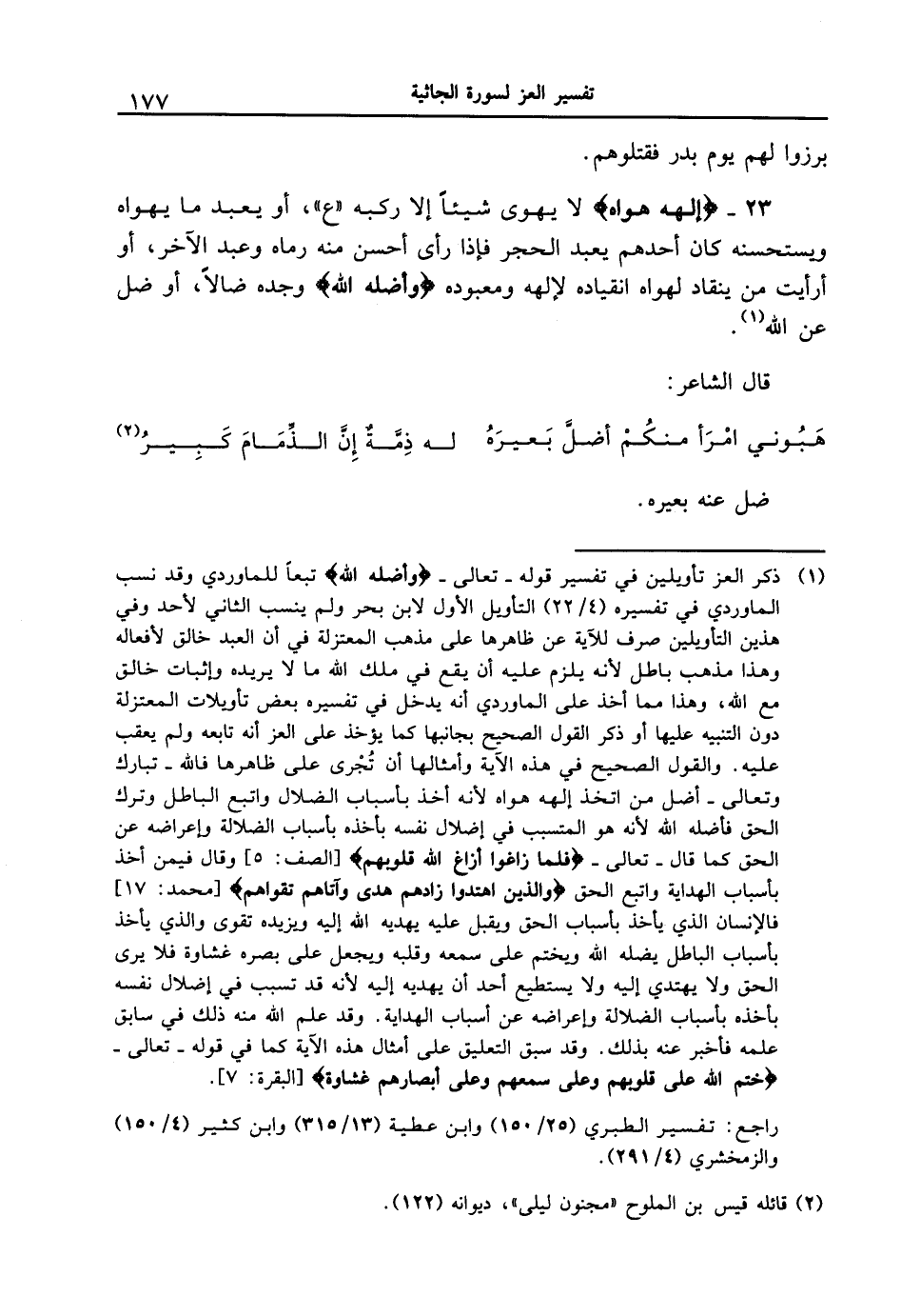 23 - {إِلَهَهُ هَوَاهُ} لا يهوى شيئاً إلا ركبه " ع "، أو يعبد ما يهواه ويستحسنه كان أحدهم يعبد الحجر فإذا رأى أحسن منه رماه وعبد الآخر، أو أرأيت من ينقاد لهواه انقياده لإلهه ومعبوده {وَأَضَلَّهُ اللَّهُ} وجده ضالاً، أو ضل عن الله.