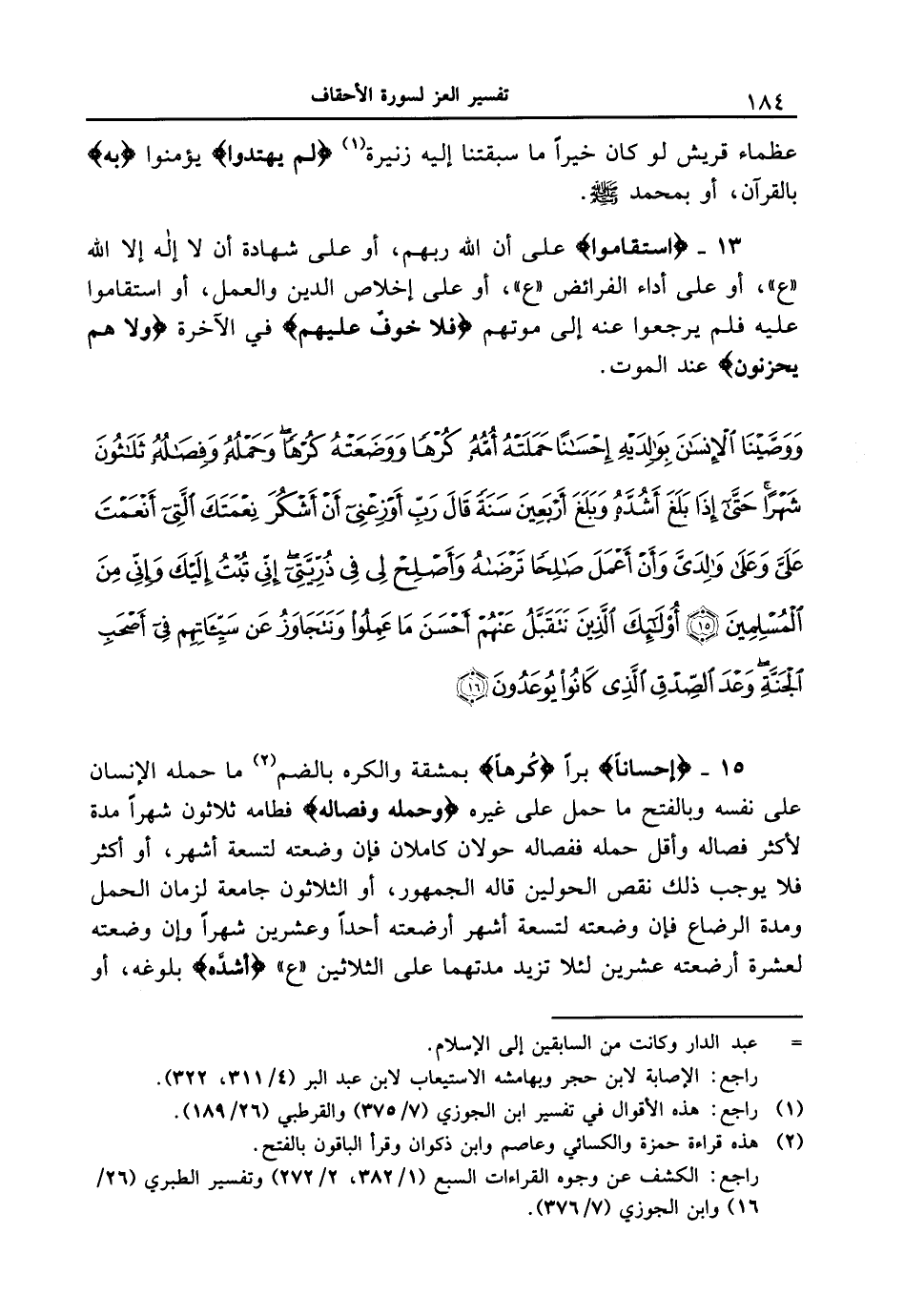 15 - {إِحْسَاناً} براً {كُرْهاً} بمشقة والكره بالضم ما حمله الإنسان على نفسه وبالفتح ما حمل على غيره {وَحَمْلُهُ وَفِصَالُهُ} فطامه ثلاثونَ شهراً مدة لأكثر فصاله وأقل حمله ففصاله حولان كاملان فإن وضعته لتسعة أشهر، أو أكثر فلا يوجب ذلك نقص الحولين قاله الجمهور، أو الثلاثون جامعة لزمان الحمل ومدة الرضاع فإن وضعته لتسعة أشهر أرضعته أحداً وعشرين شهراً وإن وضعته لعشرة أرضعته عشرين لئلا تزيد مدتهما على الثلاثين " ع " {أَشُدَّهُ} بلوغه، أو
