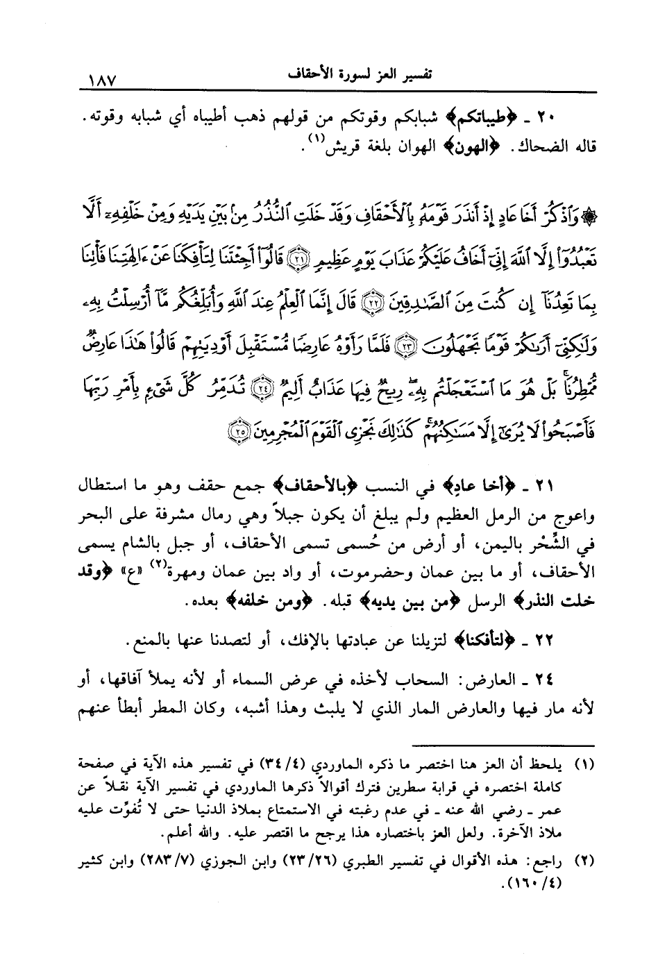 20 - {طَيِّبَاتِكُمْ} شبابكم وقوتكم من قولهم ذهب أطيباه أي شبابه وقوته. قال الضحاك. {الهون} الهوان بلغة قريش.