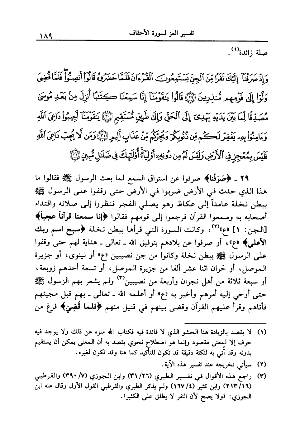 29 - {صَرَفْنَآ} صرفوا عن استراق السمع لما بعث الرسول [صلى الله عليه وسلم] فقالوا ما هذا الذي حدث في الأرض ضربوا في الأرض حتى وقفوا على الرسول [صلى الله عليه وسلم] ببطن نخلة عامداً إلى عكاظ وهو يصلي الفجر فنظروا إلى صلاته واقتداء أصحابه به وسمعوا القرآن فرجعوا إلى قومهم فقالوا {إِنَّا سَمِعْنَا قُرْآناً عَجَباً} [الجن: 1] " ع "، وكانت السورة التي قرأها ببطن نخلة {سَبِّحِ اسم ربك الأعلى} " ع "، أو صرفوا عن بلادهم بتوفيق الله - تعالى - هداية لهم حتى وقفوا على الرسول [صلى الله عليه وسلم] ببطن نخلة وكانوا من جن نصيبين " ع " أو نينوى، أو جزيرة الموصل، أو حَران اثنا عشر ألفاُ من جزيرة الموصل، أو تسعة أحدهم زوبعة، أو سبعة ثلاثة من أهل نجران وأربعة من نصيبين ولم يشعر بهم رسول [صلى الله عليه وسلم] حتى أوحي إليهم أمرهم وأخبر به " ع " أو أعلمه الله - تعالى - بهم قبل مجيئهم فأتاهم وقرأ عليهم القرآن وقضى بينهم في قتيل منهم {فما قُضِيَ} فرغ من
