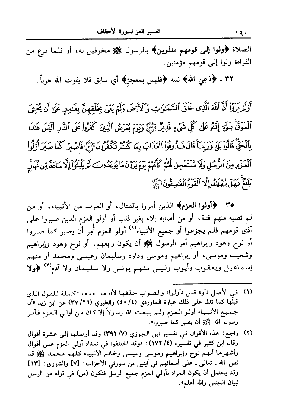 35 - {أُوْلُواْ الْعَزْمِ} الذين أمروا بالقتال، أو العرب من الأنبياء، أو من لم تصبه منهم فتنة، أو من أصابه بلاء بغير ذنب أو أولو العزم الذين صبروا على أذى قومهم فلم يجزعوا أو جميع الأنبياء أولو العزم أُمِر أن يصبر كما صبروا أو نوح وهود وإبراهيم أمر الرسول [صلى الله عليه وسلم] أن يكون رابعهم، أو نوح وهود وإبراهيم وشعيب وموسى، أو إبراهيم وموسى وداود وسليمان وعيسى ومحمد أو منهم إسماعيل ويعقوب وأيوب وليس منهم يونس ولا سليمان ولا آدم {ولا